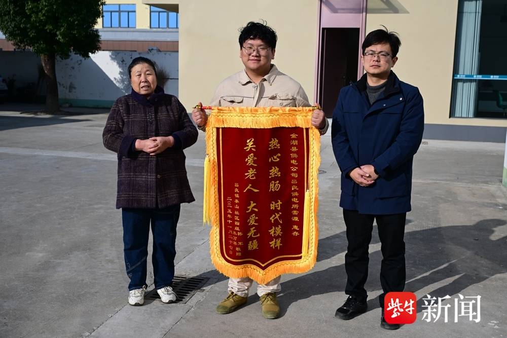 扬子晚报网12月16日讯(通讯员 李世妍 梁德斌 记者 朱鼎兆)寒夜金湖县吕良镇街头,一名老人侧躺台阶下,深色衣物几乎融入路灯照射下台阶形成的暗影中,脖子上挂着吃饭用的围兜,身上还挂着尿袋,在刺骨寒风中微弱呻吟……这令人揪心的一幕,被国网金湖县供电公司的两位 “供电小哥” 偶然撞见。他们毫不犹豫伸援手,脱衣御寒、联动警方、彻夜守护,最终助患有严重阿尔茨海默病的九旬老人平安回家。12 月 16 日上午,老人的女儿朱万琴专程送来锦旗,向救助父亲的金湖县吕良供电所网格员雷源、台区经理许伏健致以最诚挚的谢意。