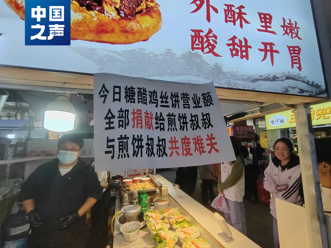 “很多商家说,把自己的营业额捐给‘煎饼叔叔’,帮助他抗癌,看到后我觉得很温暖、很感动,当天下午我就来西门支持这些商家,我用社交平台帮助这些商家,让更多的同学知道这件事。”