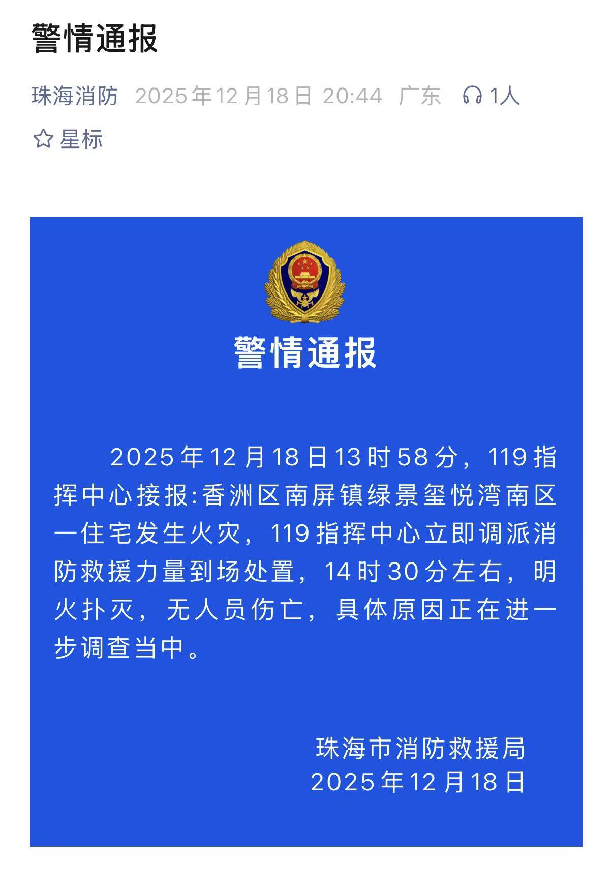 珠海市消防救援局通报