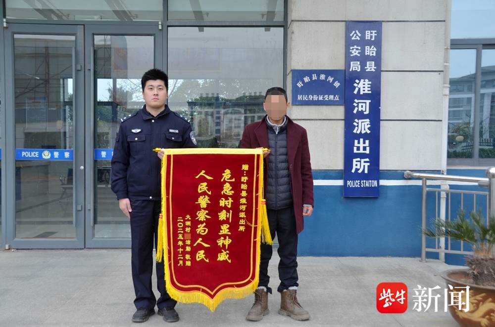扬子晚报网12月23日讯(通讯员 王琼 何清国 记者 朱鼎兆)盱眙男子刘某晚上与朋友小聚,一开心比平时多喝了三两,在回家路过一河边时,冷风一吹,腿一软,人倒进河里。幸运的是,刘某被路过居民发现并报警。22日上午,刘某带着锦旗来到盱眙县公安局淮河派出所,对民辅警在他醉酒落水后及时伸出援助之手表示感谢之情。