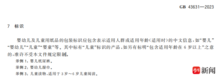 据了解,网友质疑中提到的GB43631-2023《婴幼儿及儿童用纸品基本安全技术规范》,属于现行强制性国家标准,从2025年1月1日开始正式实施。该标准在“标识”说明中明确,婴幼儿及儿童用纸品的包装标识,应包含表示适用人群或适用年龄(适用时)的中文信息,如“婴儿”“婴幼儿”“儿童”“婴童”等。同时,标准规定,文件实施之日前生产或进口的婴幼儿及儿童生活用纸品准许销售至保质期结束;实施之日前印刷的婴幼儿及儿童用纸质书本、读物等,自本文件实施之日起第13个月开始应满足本文件的要求。