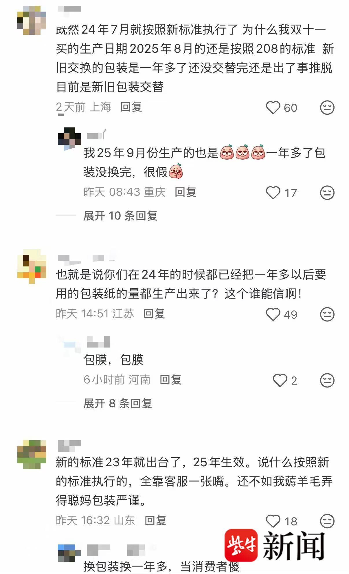 针对品牌的上述说明,有网友表示认可并希望尽快完成包装的更换,也有人在评论区留言称,GB43631标准已实施近一年,对品牌关于包装仍在切换的解释表示怀疑。