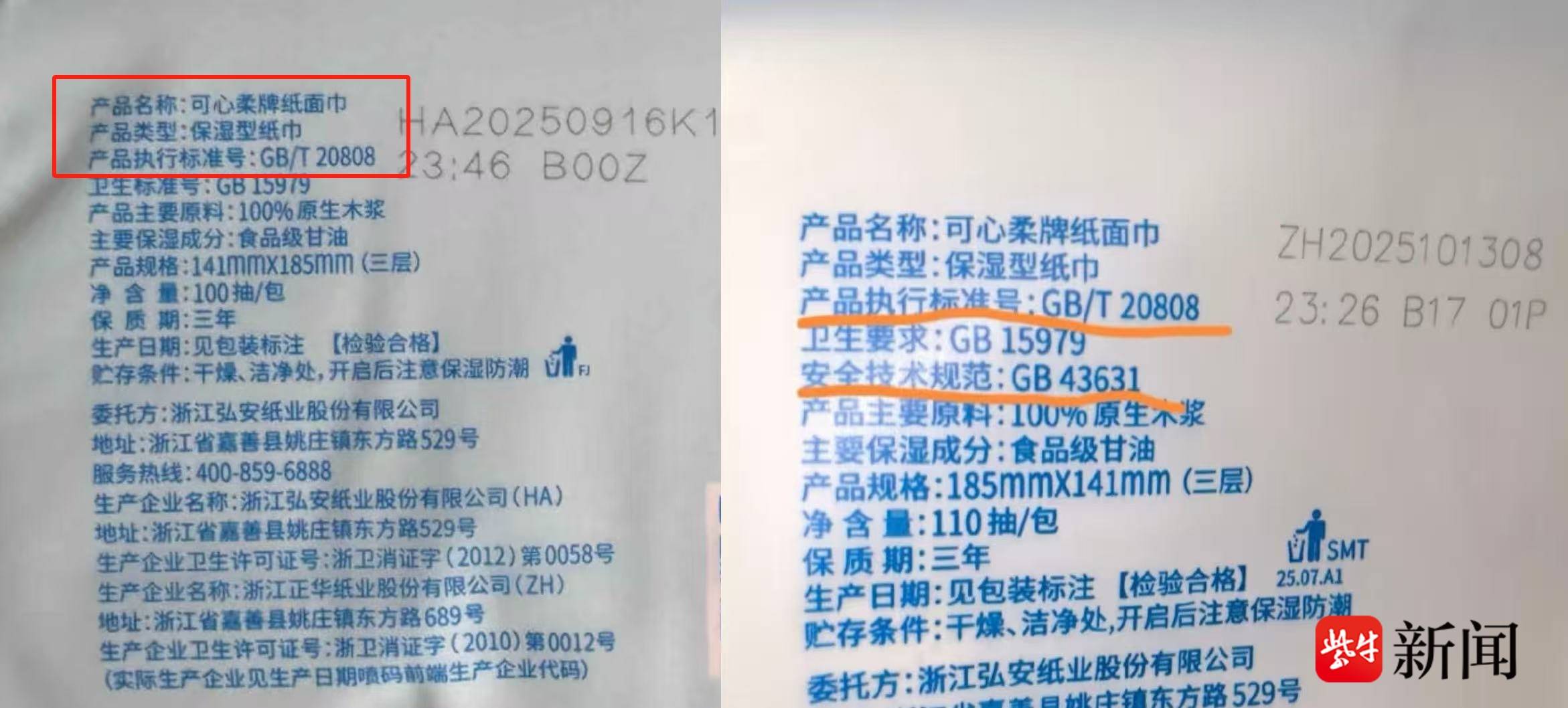消费者发布的图片显示,同样是2025年生产的“可心柔牌纸面巾”产品,有部分包装上同时标注了“产品执行标准号:GB/T20808”和“安全技术规范:GB43631”,而有的仅标注“产品执行标准号:GB/T20808”。对于这一情况,有网友提出疑问:“既然执行的都是GB/T20808标准,有些婴幼儿纸巾价格还高于普通纸巾,那我为什么要买贵的?”再考虑到婴幼儿使用纸巾时常常会出现咬拽、误食等情况,不少宝爸、宝妈对产品的安全性感到担忧。