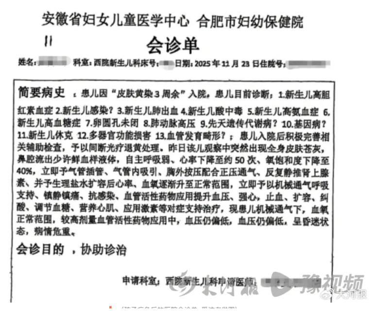 陈先生介绍,孩子于2025年10月27日在合肥市妇幼保健院西区剖宫产出生,出生后因黄疸未退,于11月20日到该院新生儿科住院,接受蓝光治疗。由于新生儿科实行封闭管理,不允许家属陪护,仅每周一、三、五通过电话告知孩子情况。21日,医院电话告知孩子一切正常,黄疸值虽有反弹但无需担忧。