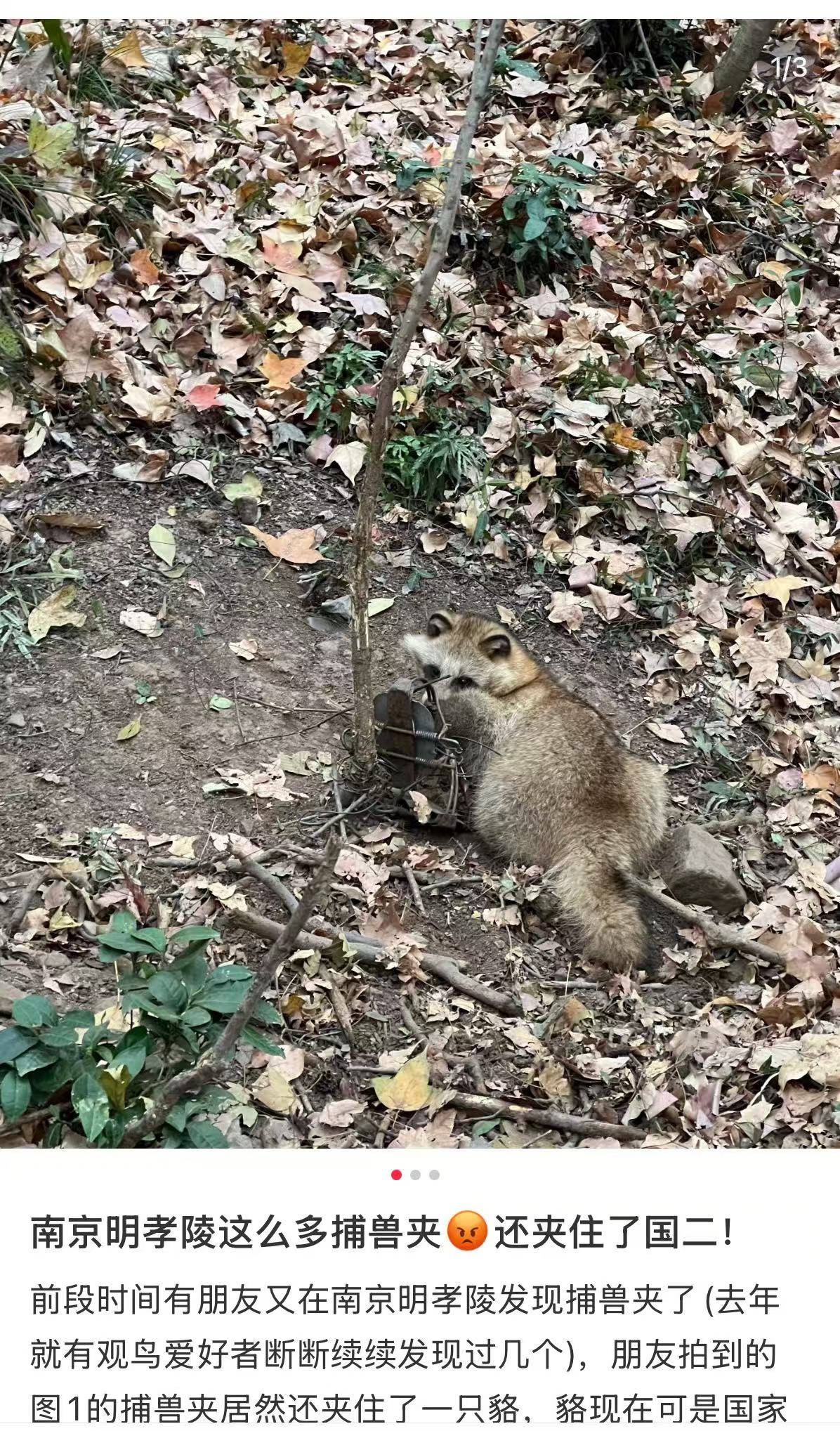 近日,有网友发帖爆料,南京明孝陵景区附近疑有人私自布设捕兽夹,一只国家二级保护动物貉不幸被夹,引发广泛关注。