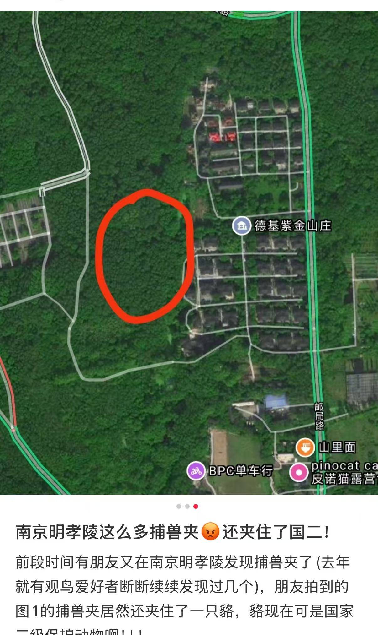 据发帖网友介绍,此前其朋友在明孝陵景区周边发现了捕兽夹,一只貉的前腿被夹住。事发后第一时间联系相关部门,明孝陵景区随即派工作人员前往拆除兽夹,受伤的貉也被送往红山动物园接受救治。令人忧心的是,仅仅数日之后,又有人在同一区域接连发现多个捕兽夹,实在触目惊心。网友同时担忧,一旦有游客误入此地,极有可能被误伤。该网友在帖中大致标注了捕兽夹的大致位置,并分析称,此处地处偏僻,或为监控死角,防范此类隐患恐怕只能依靠加强人力巡查。他坦言,发布这条帖子,既是希望能引起相关部门的重视,及时消除安全隐患,也是为了提醒广大市民和游客提高警惕。