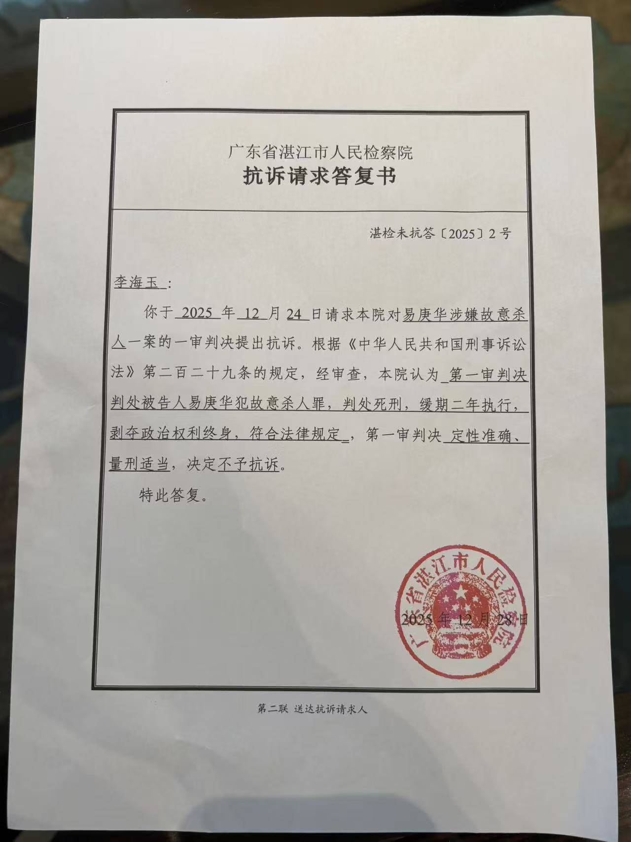 12月28日,湛江市检察院做出答复,认为根据《中华人民共和国刑事诉讼法》第二百二十九条的规定,经审查,本院认为第一审判决判处被告人易庚华犯故意杀人罪,判处死刑,缓期二年执行,剥夺政治权利终身,符合法律规定,第一审判决定性准确,量刑适当,决定不予抗诉。扬子晚报/紫牛新闻记者 宋世锋