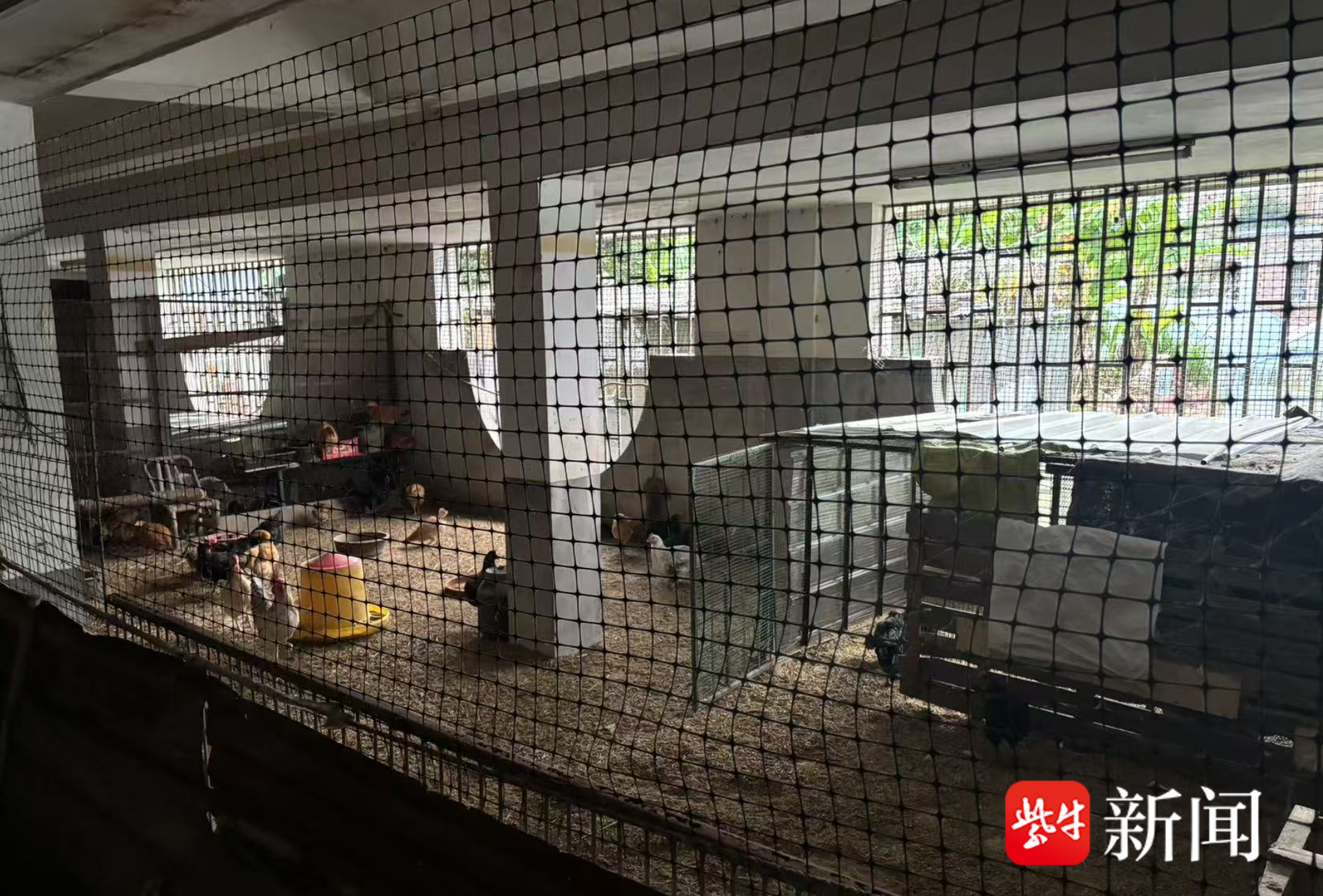 陈先生随即下楼查看,发现原本整洁的地下室被搭建了三四个鸡舍,饲养着四五十只鸡鸭。现场堆满杂物、一片狼藉,墙壁和地面布满鸡粪、污渍及饲料残留。