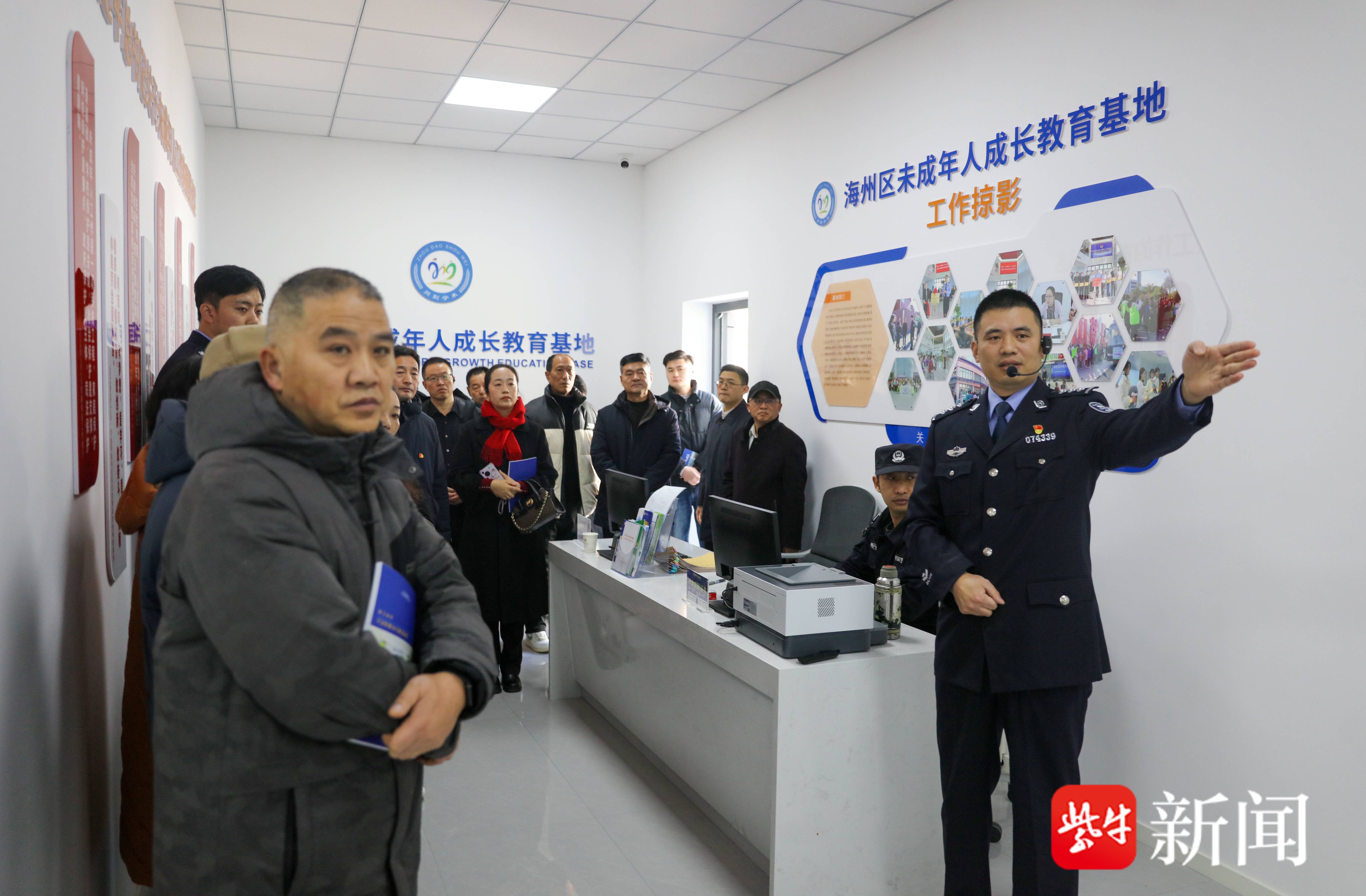 随后,一行人来到海州区未成年人成长教育基地,民警依次从家庭指导、法律援助、心理疏导、职业规划、法治教育、行为规范等方面,分享基地的运行成效和工作日常,全方位展现了海州公安守护未成年人健康成长的用心与担当。