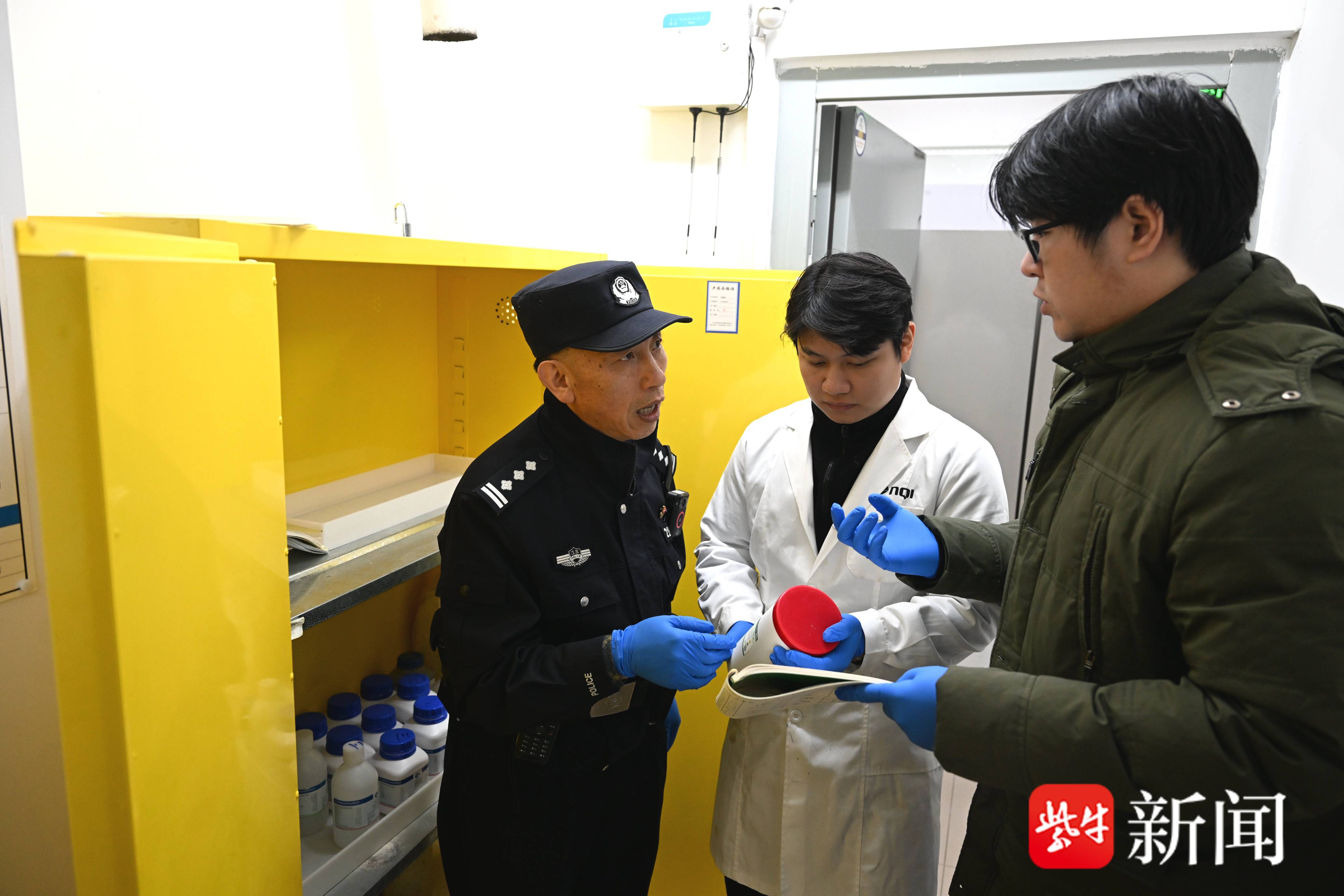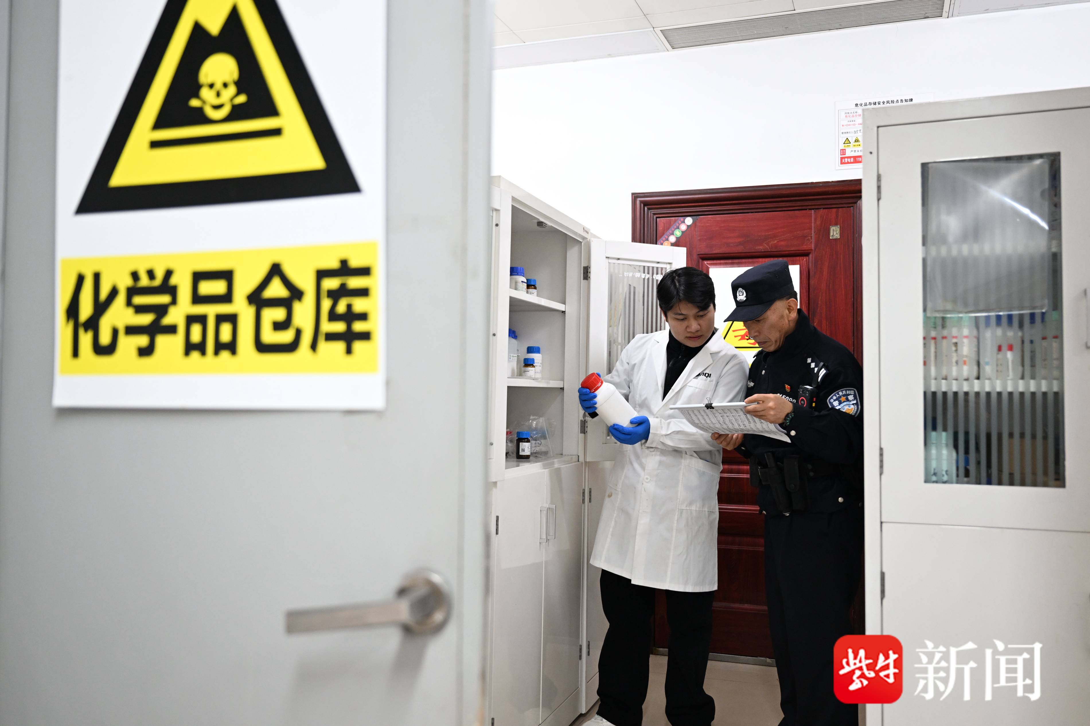 1月8日上午,南京市公安局建邺分局沙洲派出所民警到辖区企业开展易制毒化学品安全检查。图为民警对该企业易制毒化学品的存储、管理、使用流向登记、出入库等情况开展了全面的检查。