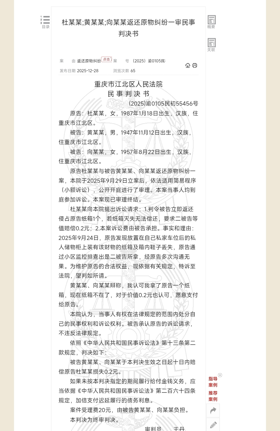 这是中国裁判文书网近日公布的一个判决书,内容显示原告杜某某与被告黄某某,向某某返还原物纠纷一案由重庆市江北区法院于2025年9月29日立案后,依法适用简易程序(小额诉讼),公开开庭进行了审理。本案当事人均到庭参加诉讼。