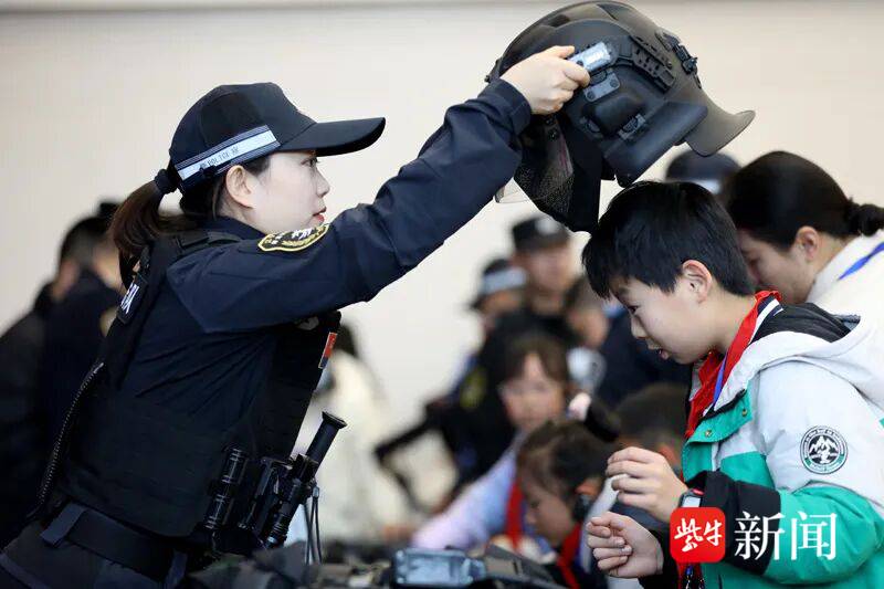 在特警装备展示区,孩子们兴奋地围在枪支展示台,触摸着防弹衣的坚硬纹理,好奇地试戴起头盔,稚嫩的手掌抚过战术腰带上的每一件装备。