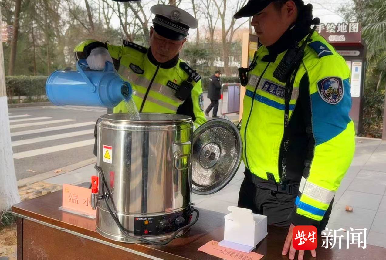 1月10日一早,陵园路和石象路交叉口,南京交警玄武区大队民警王军给一个便民水桶添满了热水,随即踏上了巡逻之路。