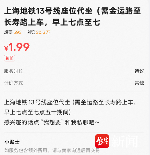 扬子晚报网1月15日讯(记者 郭一鹏) 近日,某平台上出现一项名为“地铁代坐”的服务,引发关注。有上海网友称,早高峰7点至7点50期间,自己上车提前占座,再私下“让座”给买家,交易座位的“使用权”,单次售价1.99元。据悉,这类上海地铁“代坐”服务帖,主要集中在2号、9号、10号、13号等线路。发帖者多从这些线路的起点站附近上车,表示若有人购买服务,可将座位让出。