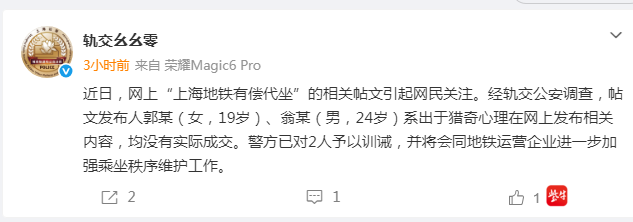 对此,上海地铁服务热线工作人员曾明确表示,此类“代坐”服务不允许,地铁倡导文明乘车,若市民发现此类行为,可及时联系地铁,必要时将派工作人员或民警上车处理。紫牛新闻记者注意到,就在今天(15日)中午,上海市公安局城市轨道和公交总队官方微博@轨交幺幺零 发布了相关情况说明,称经轨交公安调查,帖文发布人郭某(女,19岁)、翁某(男,24岁)系出于猎奇心理在网上发布相关内容,均没有实际成交。警方已对2人予以训诫,并将会同地铁运营企业进一步加强乘坐秩序维护工作。