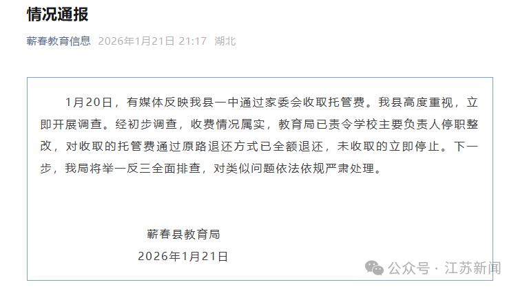 1月20日,有媒体反映我县一中通过家委会收取托管费。我县高度重视,立即开展调查。经初步调查,收费情况属实,教育局已责令学校主要负责人停职整改,对收取的托管费通过原路退还方式已全额退还,未收取的立即停止。下一步,我局将举一反三全面排查,对类似问题依法依规严肃处理。