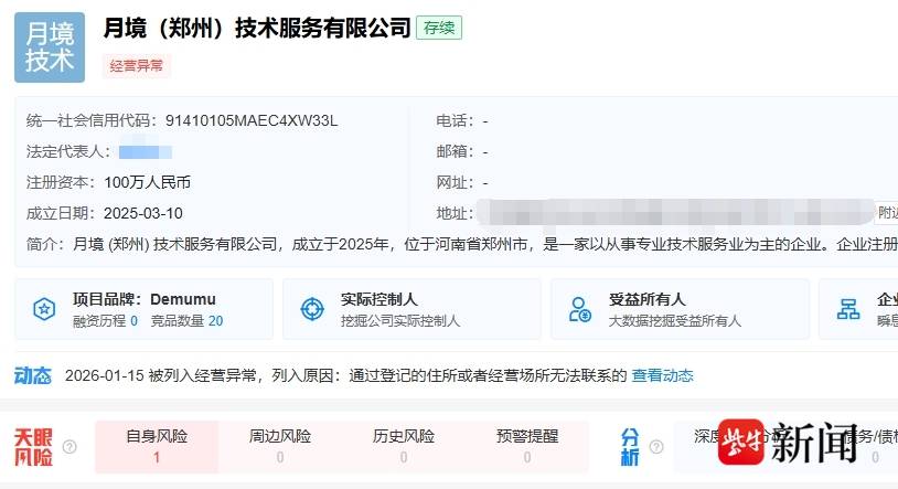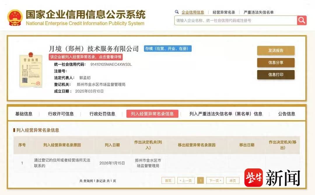 天眼查信息显示,月境(郑州)技术服务有限公司成立于2025年3月,经营范围含软件开发、软件销售、计算机软硬件及辅助设备批发、计算机软硬件及辅助设备零售、互联网信息服务、出版物互联网销售等。