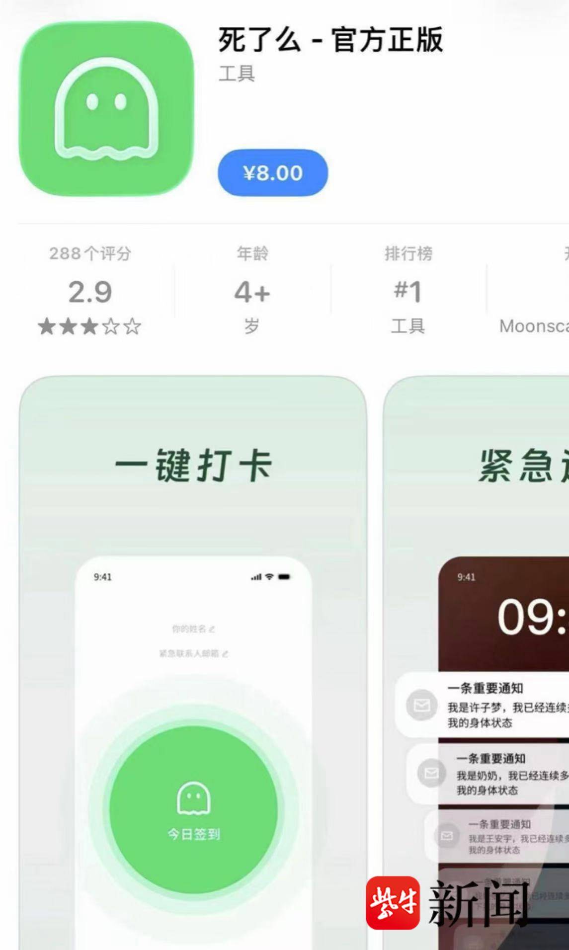 据扬子晚报/紫牛新闻此前报道,近期,一款面向独居人群的安全工具APP“死了么”持续引发社会关注。据了解,“死了么”APP主打的是简洁易操作的独居安全监测服务,此前售价8元,还曾登上苹果应用商店付费排行榜首位。