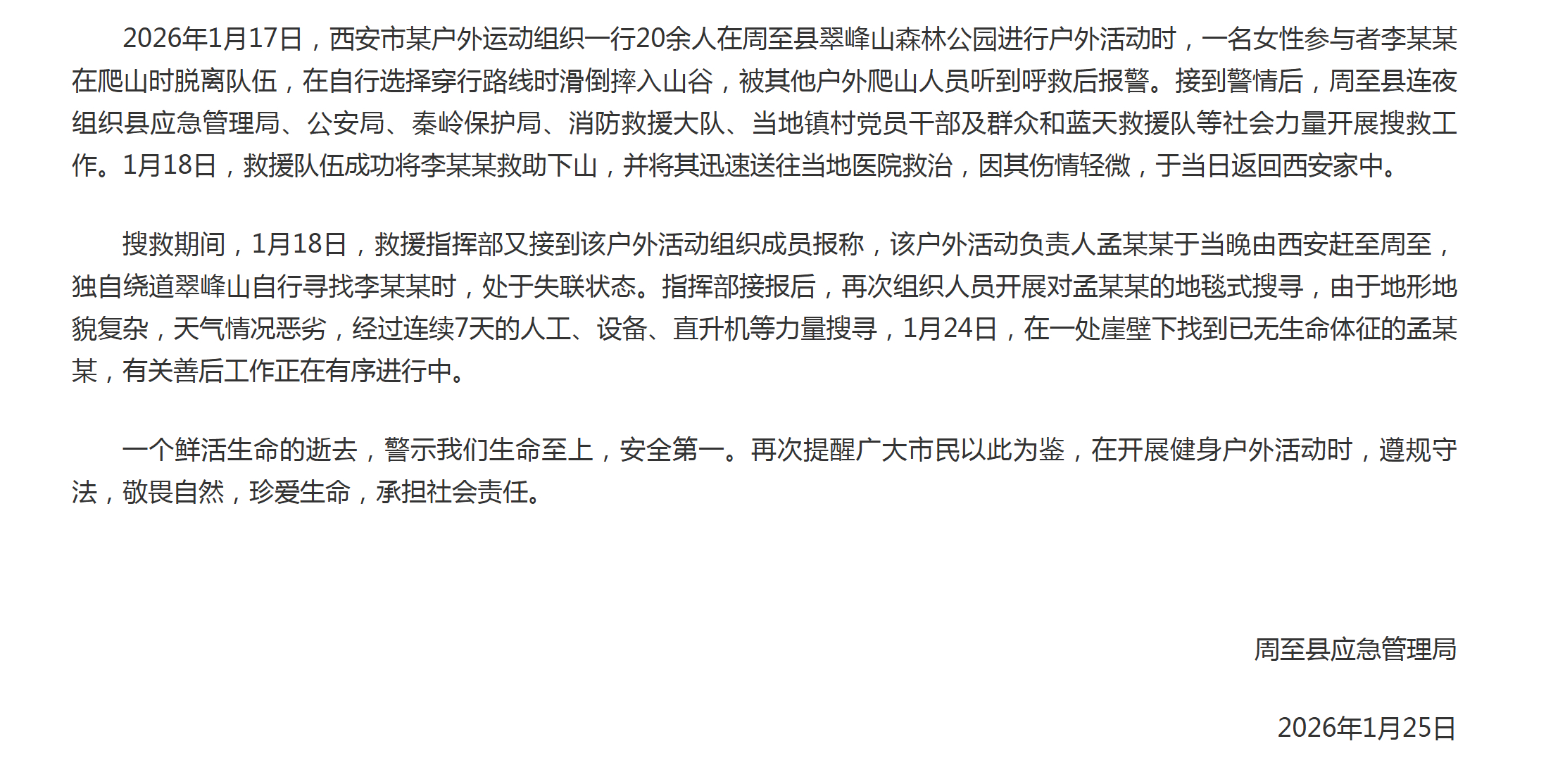 通报称,2026年1月17日,西安市某户外运动组织一行20余人在周至县翠峰山森林公园进行户外活动时,一名女性参与者李某某在爬山时脱离队伍,在自行选择穿行路线时滑倒摔入山谷,被其他户外爬山人员听到呼救后报警。