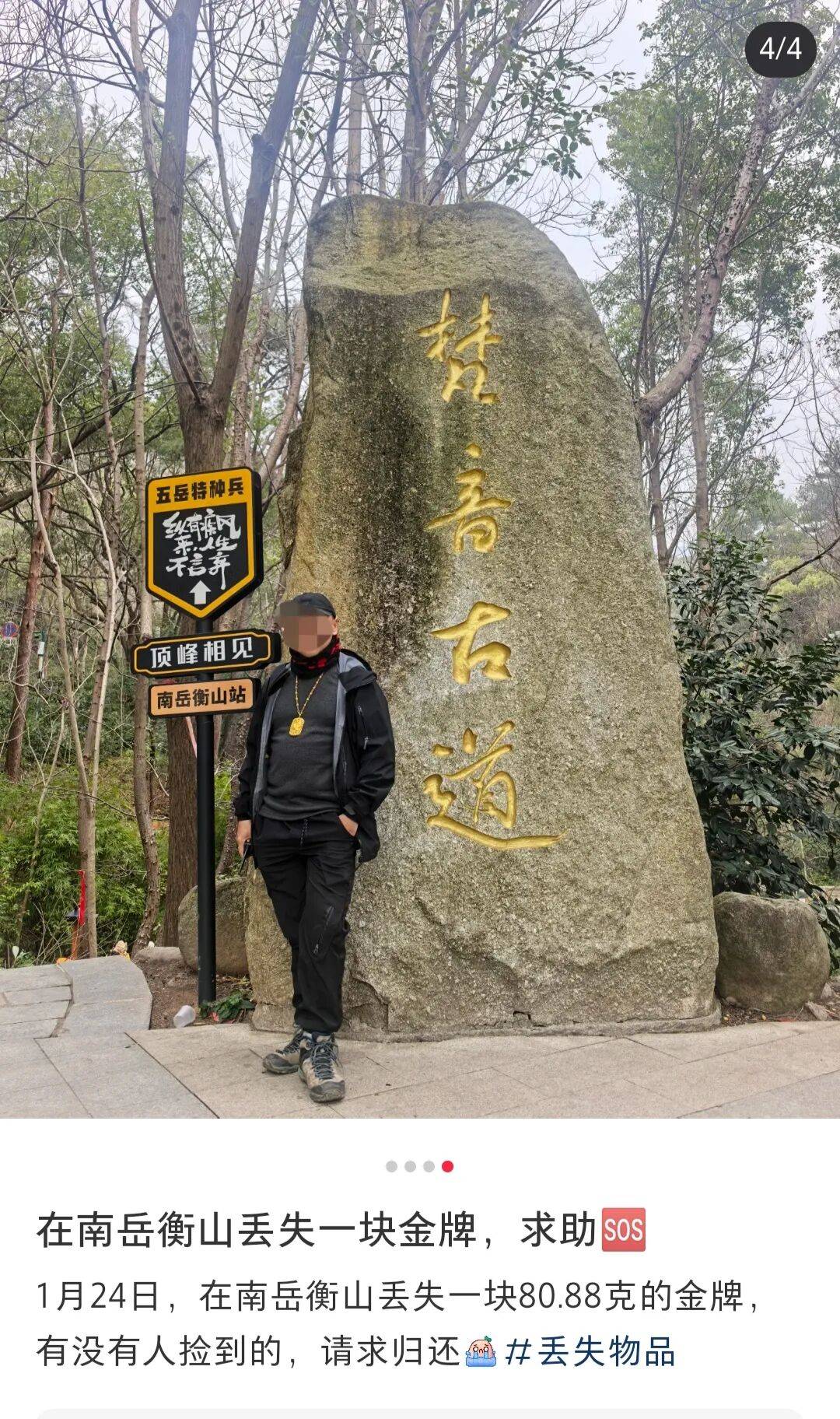 1月24日下午,一网友反映当天在衡山景区丢失80克金饰,已经报警求助。图片显示,该男子戴着一块有金链子,链子上有一块金牌子。1月25日晚,衡阳市公安局南岳分局半山亭派出所工作人员告诉潇湘晨报记者,一游客反映丢失金吊牌一事,他们还在帮忙找,“具体情况会发通报。”