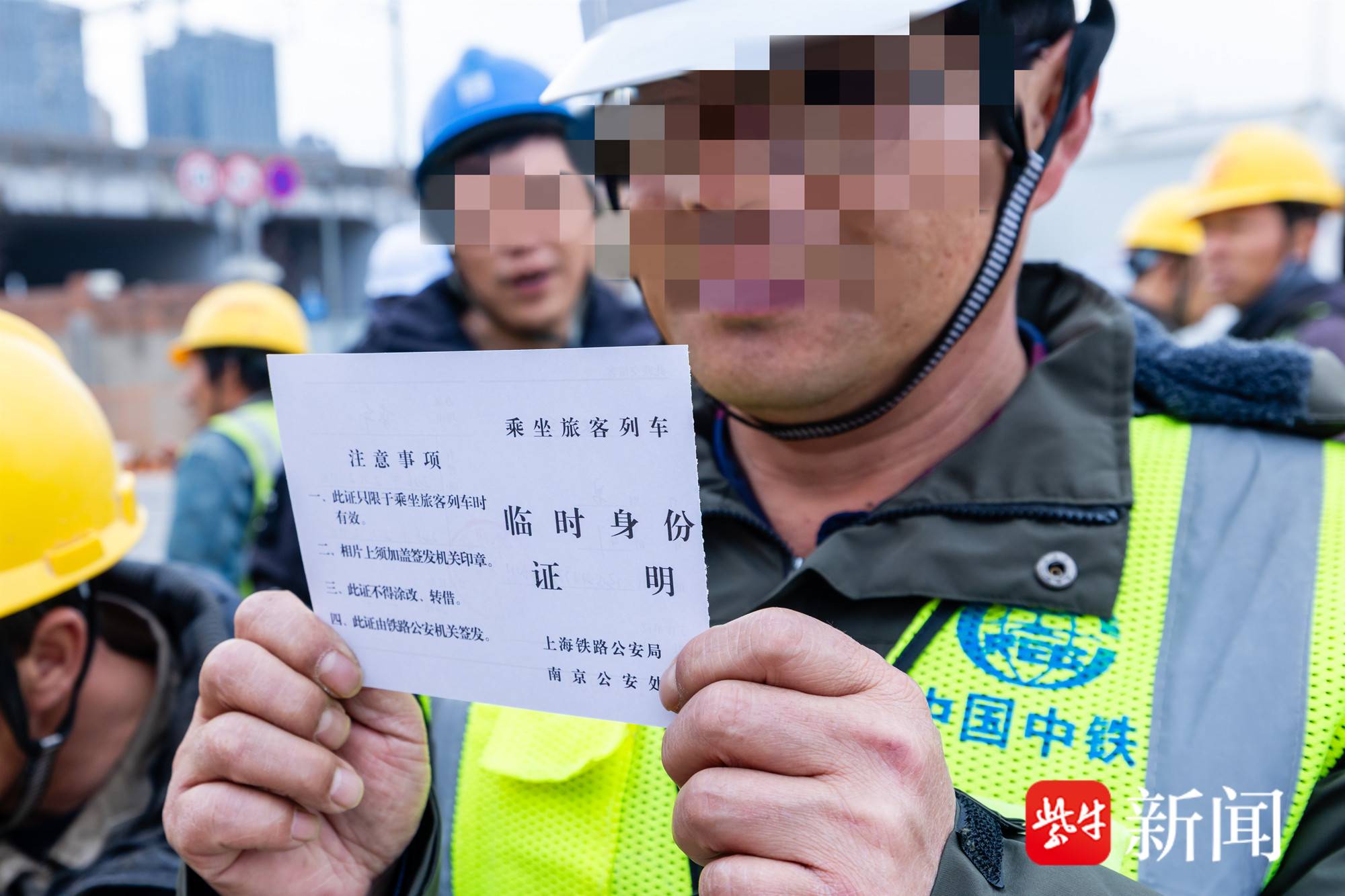 图为南京南站派出所民警在临时乘车证明办理点,为工友们现场办理临时身份证明