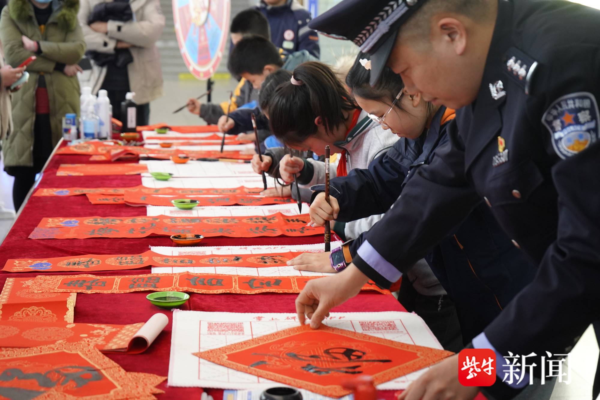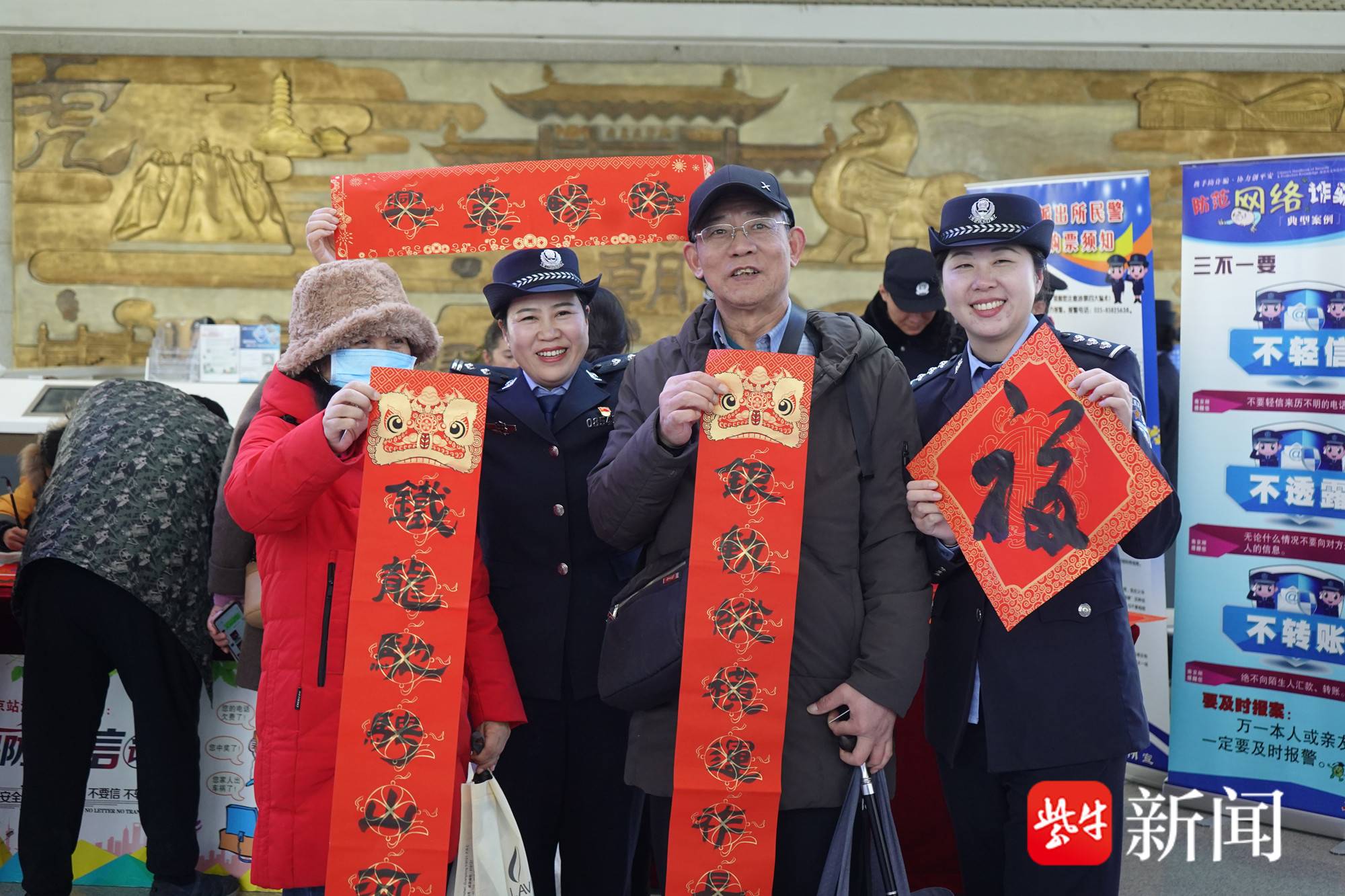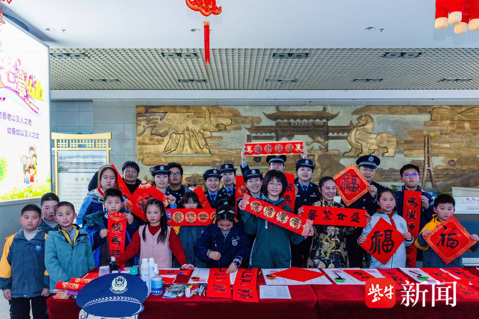 下午4时许,南京站候车大厅中央的活动区域已人头攒动。书法方面颇有造诣的陶警官带着几位来自吕伟传统书法培训中心的小朋友们现场挥毫,隶、楷、行、草各体“福”字跃然纸上,墨香与春节前的烟火气交织。派出所民警将烫金“福”字、春联和定制的“平安春运”主题台历送到旅客手中,同步附上印有反诈知识的宣传手册。“往年回家总觉得匆忙又紧张,今年拿到民警送的福字,心里一下子暖和起来了。”准备返乡的安徽籍务工人员王先生说,他还特意请民警写了一副“旅途平安”的春联,准备带回老家。