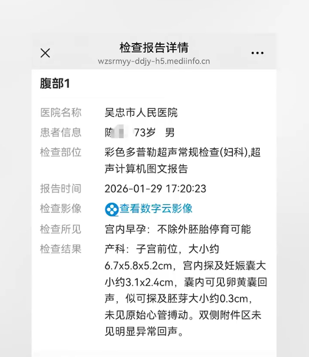 1月30日,有网友在社交媒体发帖表示,73岁的老爷子心脏不适到宁夏吴忠市人民医院检查,超声检查结果显示却为宫内早孕,不排除胚胎停育可能,引发广大网友的关注。扬子晚报/紫牛新闻记者从宁夏吴忠市人民医院获悉,因当日医院医学影像存储与传输系统故障且工作人员审核把关不严导致电子报告单信息错误。