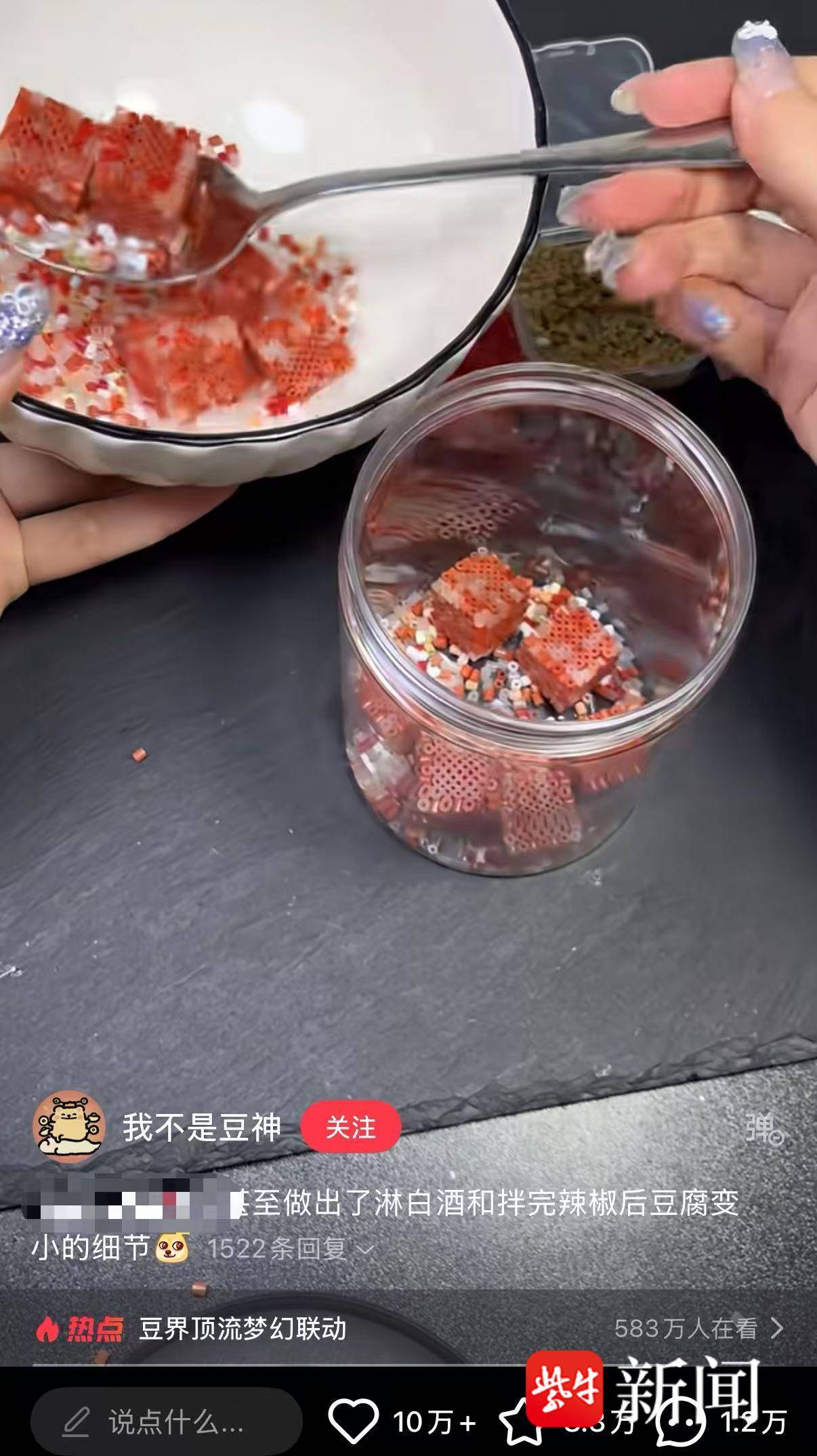 近期网络上兴起“万物皆可霉豆腐”的模仿热潮,爱好者们便紧跟热点,用拼豆还原霉豆腐造型:以浅灰色拼豆做豆腐胚,叠加白色拼豆模仿发酵菌丝,再用红、棕两色拼豆制作辣椒、花椒等调料,甚至能还原霉豆腐裹好装罐的形态。这类作品兼具热点的趣味与手工的巧思,相关视频点赞量很快突破十万。
