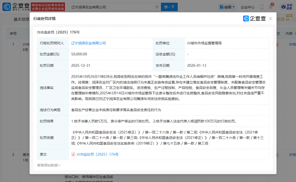 2月2日,扬子晚报/紫牛新闻记者从企查查获悉,近日,“员工在酸菜池中抽烟吐痰”涉事企业,辽宁润泽农业有限公司行政处罚结果公开,该公司被罚款5万元并被责令停产停业,法定代表人杨某被罚款100万元。