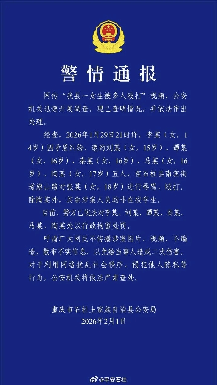 扬子晚报网2月2日讯(记者 郭一鹏) 2月1日,重庆市石柱土家族自治县公安局发布警情通报:网传“我县一女生被多人殴打”视频,公安机关迅速开展调查,现已查明情况,并依法作出处理。经查,2026年1月29日21时许,李某(女,14岁)因矛盾纠纷,邀约刘某(女,15岁)、谭某(女,16岁)、秦某(女,16岁)、马某(女,16岁)、陶某(女,17岁)五人,在石柱县南宾街道旗山路对张某(女,18岁)进行辱骂、殴打。除陶某外,其余涉案人员均非在校学生。目前,警方已依法对李某、刘某、谭某、秦某、马某、陶某处以行政拘留处罚。