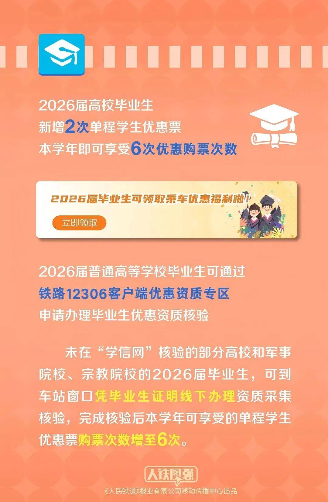 未在“学信网”核验的部分高校和军事院校、宗教院校的2026届毕业生,可到车站窗口凭毕业生证明线下办理资质采集核验,完成核验后本学年可享受的单程学生优惠票购票次数增至6次。