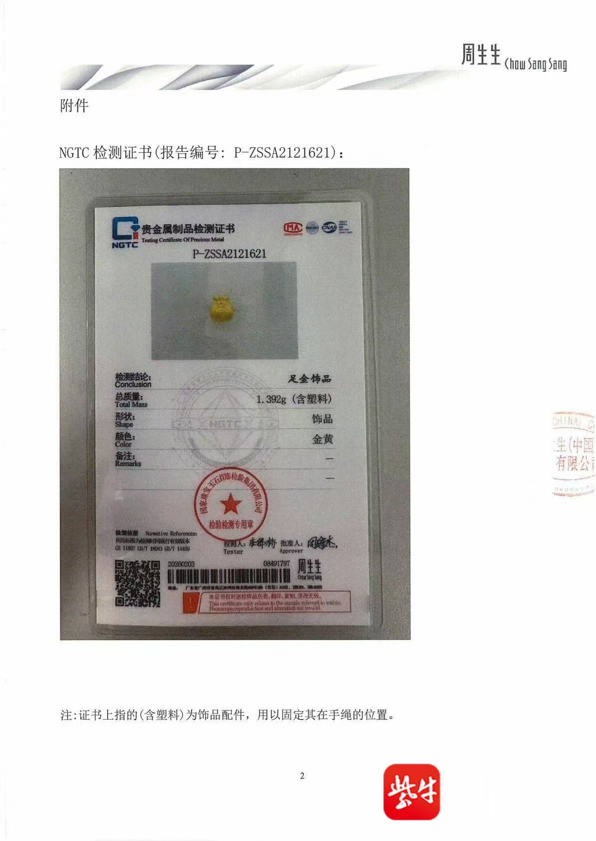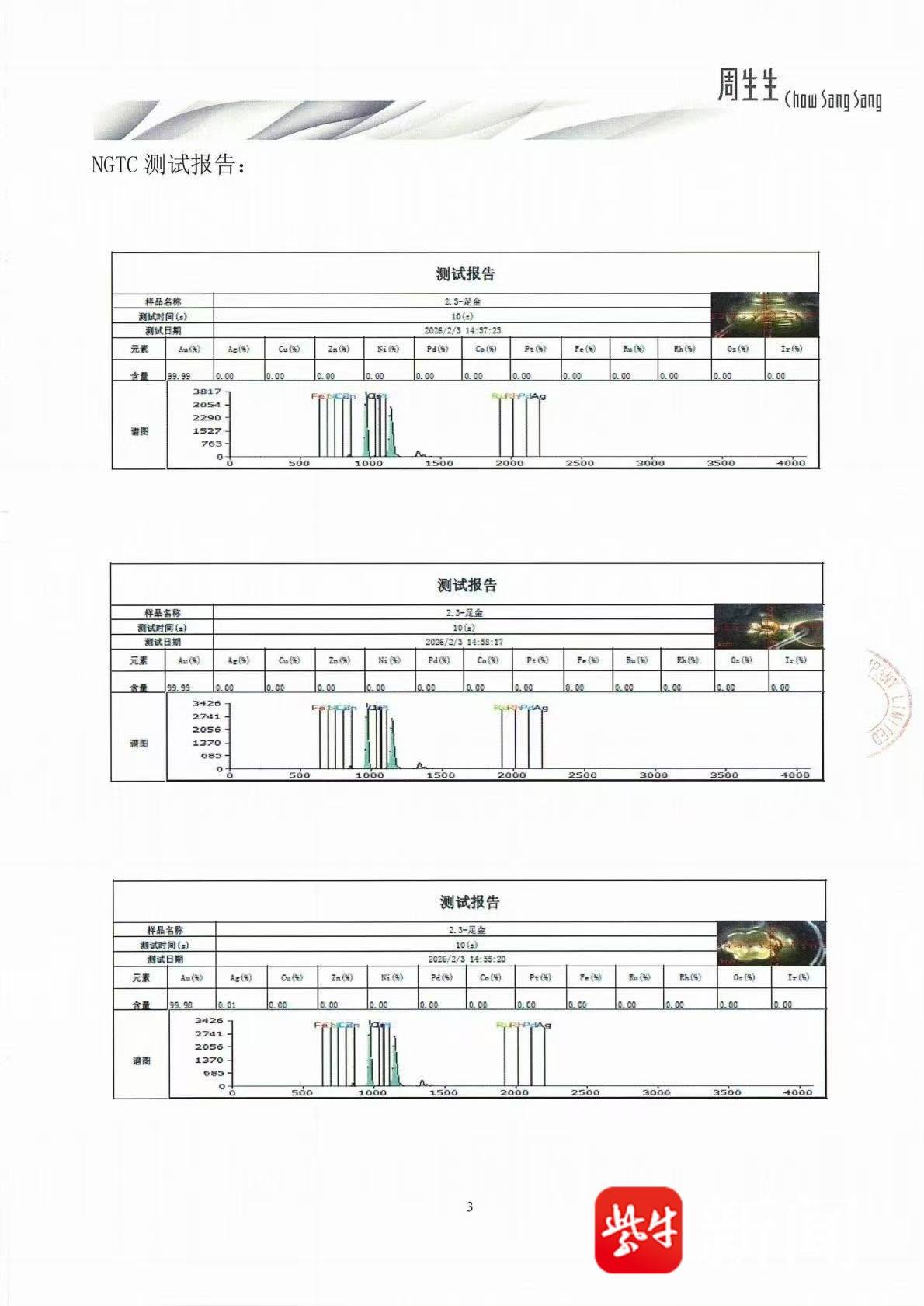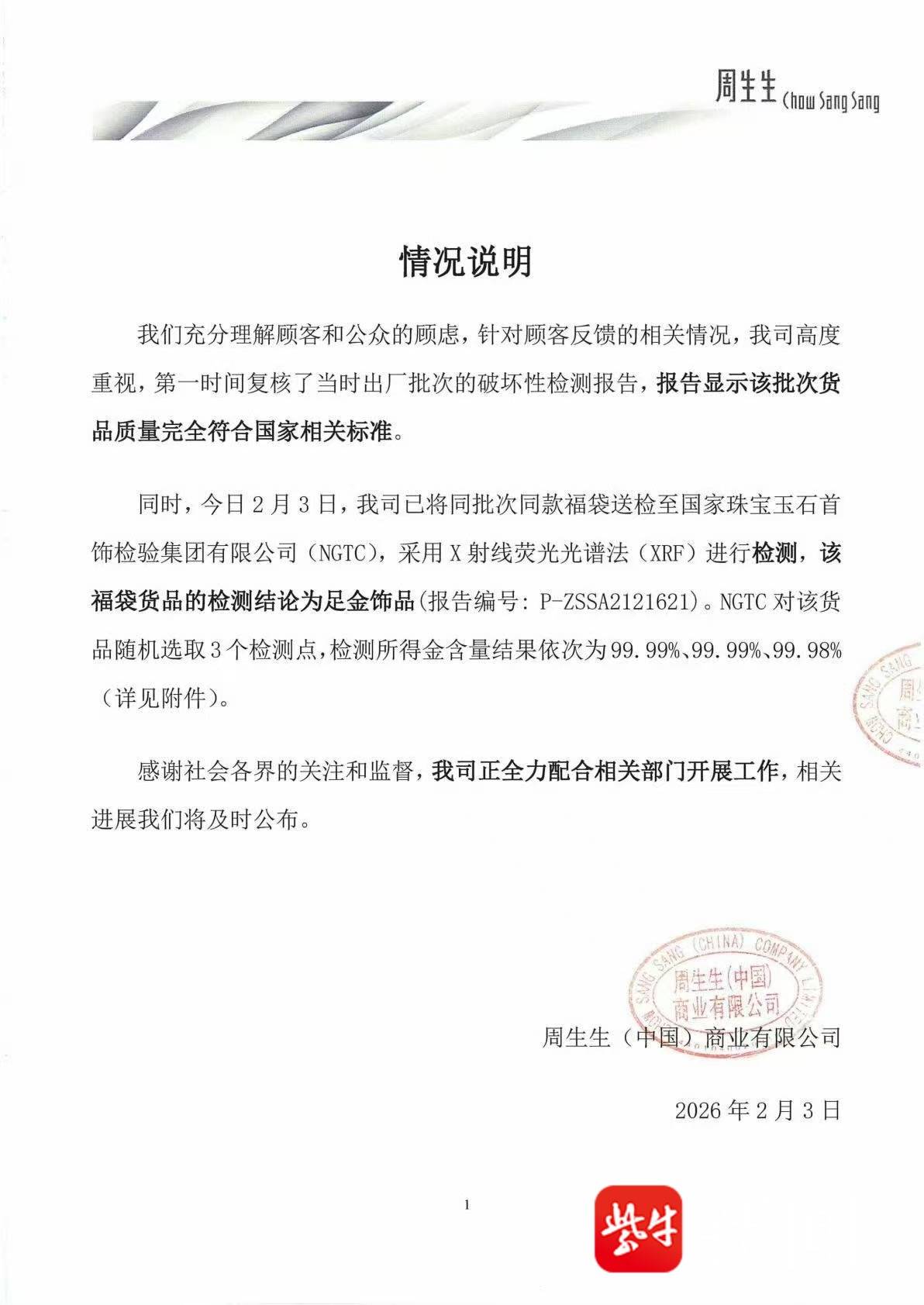 同时,今日2月3日,我司已将同批次同款福袋送检至国家珠宝玉石首饰检验集团有限公司(NGTC),采用X射线荧光光谱法(XRF)进行检测,该福袋货品的检测结论为足金饰品(报告编号:P-ZSSA2121621)。NGTC对该货品随机选取3个检测点,检测所得金含量结果依次为99.99%、99.99%、99.98%(详见附件)。
