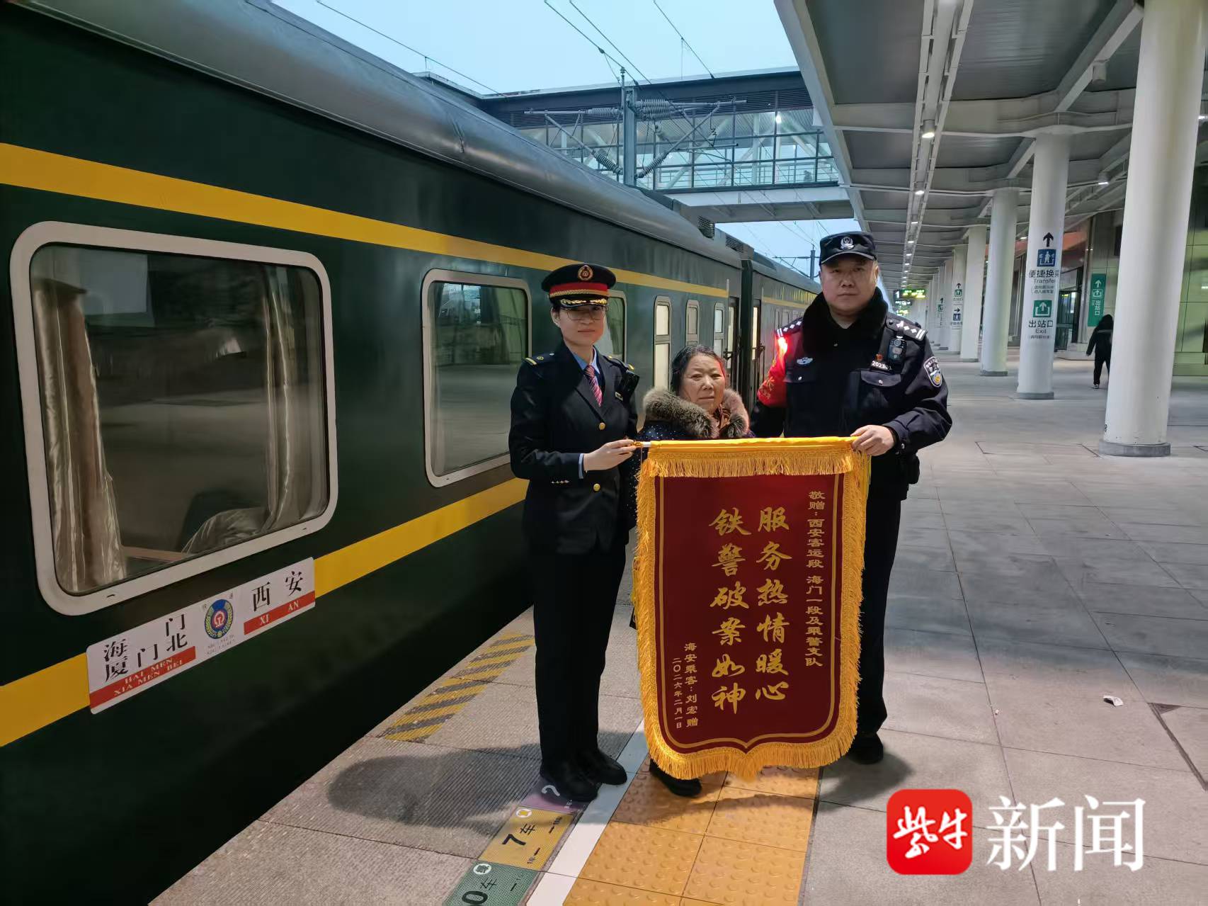 2月2日,返程的K62次列车抵达海安站,潘女士如约前来领取失物。面对失而复得、内装重要财物的背包,她激动不已,并特意带来一面锦旗,向列车工作人员认真负责、热心助人的职业精神表示衷心感谢。