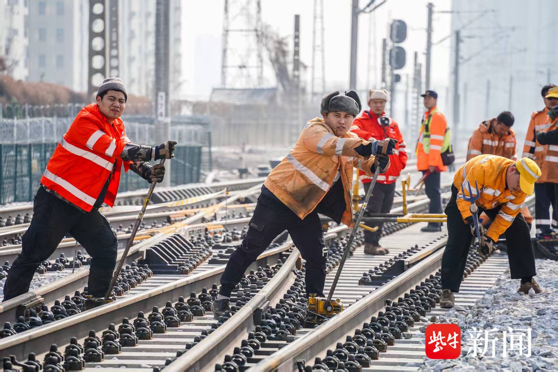 春运已开启,上午10:28,在京沪上行林场站南部道岔上,8名身着橘黄色的工作服铁路养护人员正在紧张而有序地忙碌着,对林场站新铺设的道岔进行精心养护,匠心护航旅客返乡路。