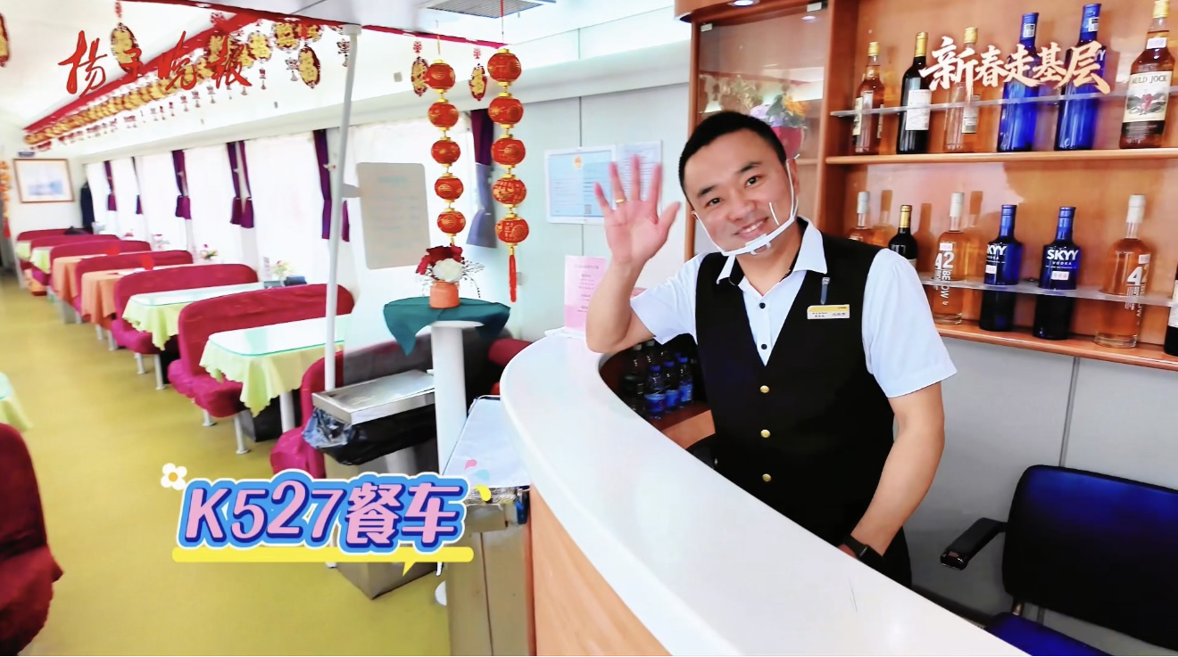 下午1点半,记者跟随餐车班组登上K527次列车,一踏入餐车,年味扑面而来。车厢顶部挂满了红彤彤的新年挂饰,一串串灯笼穗子轻轻摇晃。车窗上,大大小小的“福”字透着窗外飞驰的田野,格外鲜亮。四张餐桌上铺上了崭新的红色餐垫,餐巾被折成各式各样的花朵——玫瑰、百合、满天星。连座椅都穿上了干净整洁的“新衣”,暖黄的阳光透过车窗洒进车厢,温馨得让人恍惚。