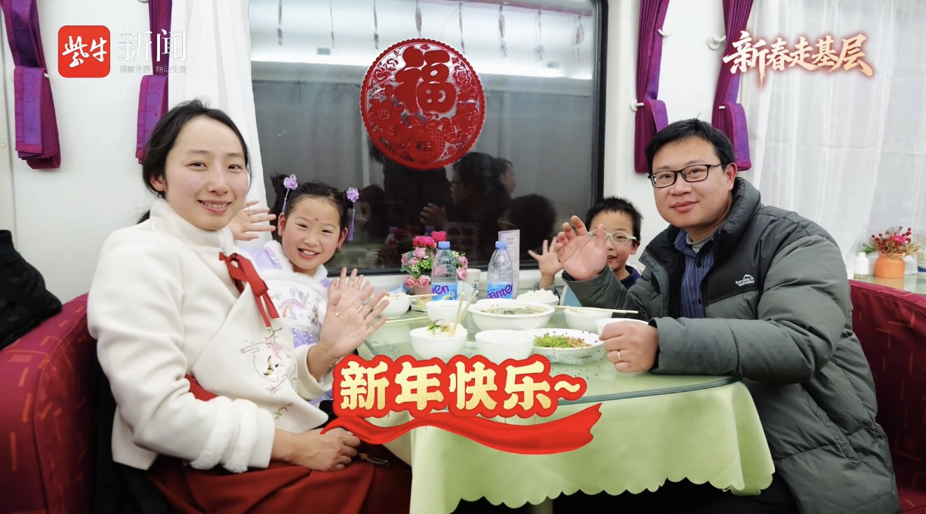 张先生一家四口刚从苏州游玩归来,坐火车回嘉兴过年。母女二人换上喜庆的中式棉袄,扎起利落的丸子头。饭菜上桌,热气升腾间,她们的笑容被晕染得格外灿烂——这趟晃晃悠悠的K527次绿皮车上,年味已经提前“开席”。