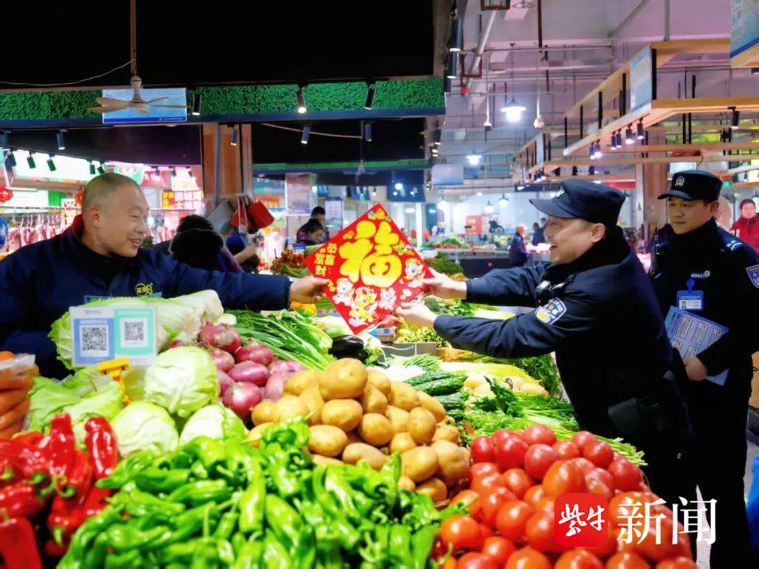 龙池派出所民警深入农贸市场,为群众送福,同时宣传安全知识。