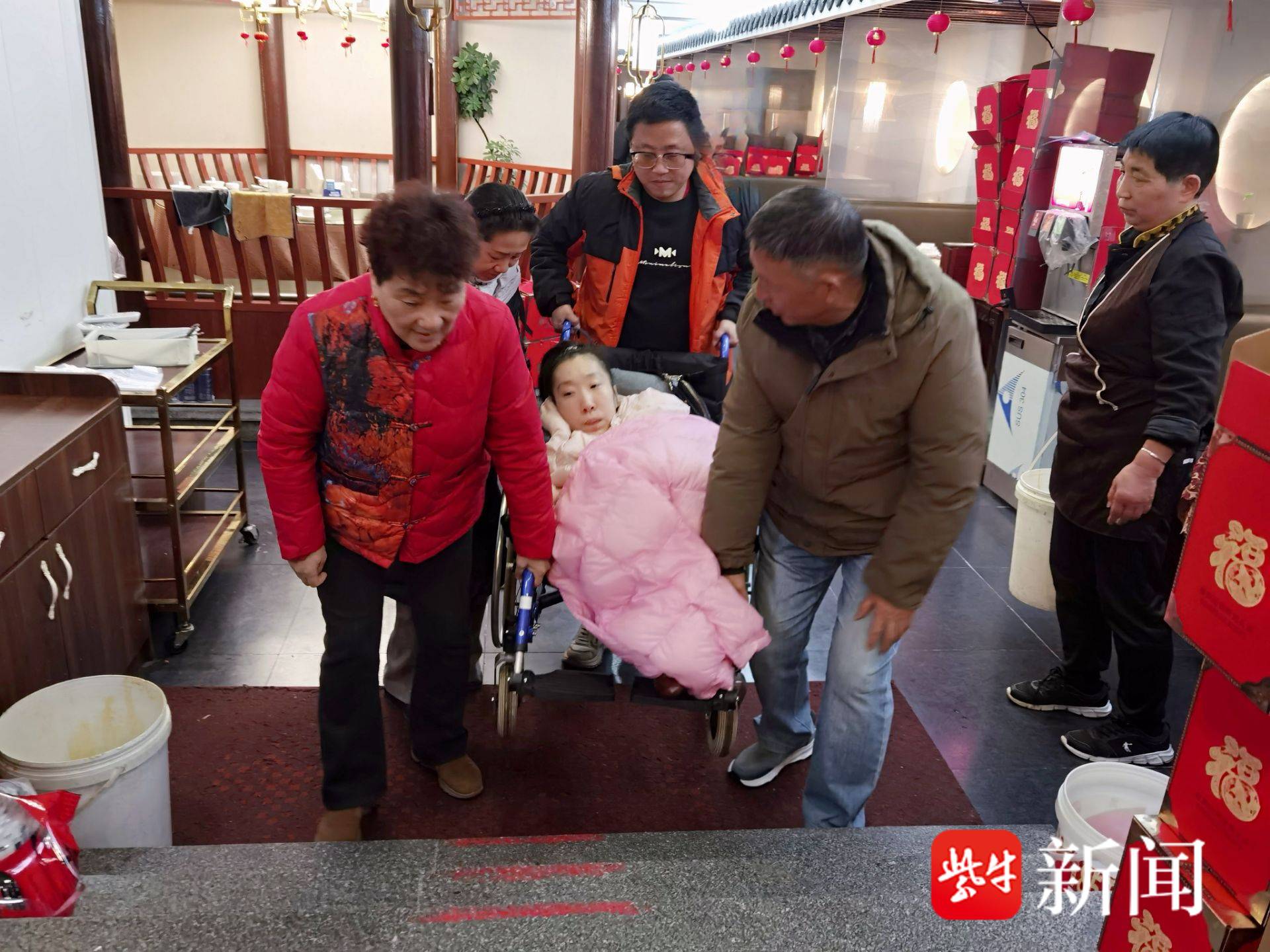 陈正乐(钱右)和员工一起,带着橙橙和母亲许月秀(前左)外出新年聚餐。