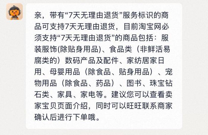 记者就此咨询了淘宝、京东以及抖音平台。其中,淘宝客服回复了平台要求7天无理由退货的产品品类,其中并未明确标明有盲盒类。