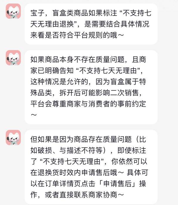 抖音客服明确回复,如果商品本身不存在质量问题,且商家已明确告知“不支持七天无理由退换”,这种情况平台是允许的。因为盲盒属于特殊品类,拆开后可能影响二次销售,平台会尊重商家与消费者的事前约定。