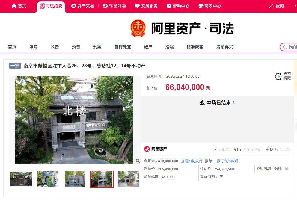 2月27日,被很多南京人俗称为“张治中公馆”的沈举人巷26号、28号房产最终被南京市鼓楼区人民法院在阿里资产平台成功拍出。这处评估价为9426.39万元的房产成交价锁定在6604万元。