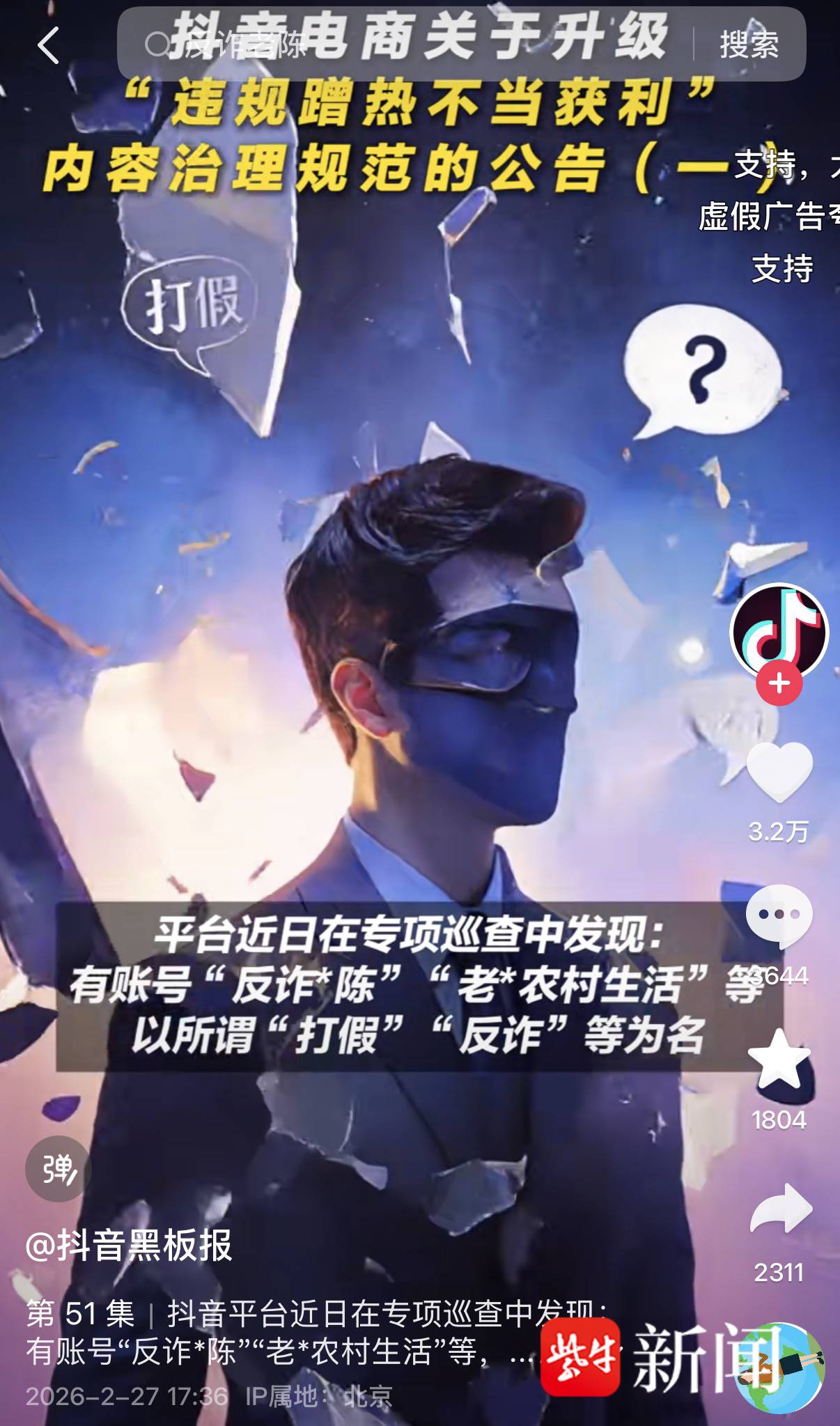 2月27日,抖音黑板报发布内容,称抖音平台近日在专项巡查中发现:有账号“反诈*陈”“老*农村生活”等,以所谓“打假”“反诈”等为名,在缺乏科学分析、缜密研判甚至事实依据的前提下,以“喊话”等形式,反复发布恶意攻击、无端质疑。甚至发布侮辱他人人格或企业声誉的相关信息,试图通过标签化攻击,刻意煽动网友情绪、营造对立,并借此引发各方关注,收割争议流量,扰乱商业秩序、破坏公平竞争。