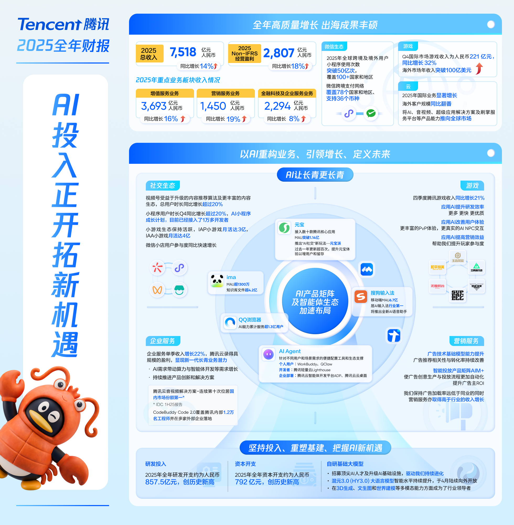 腾讯董事会主席兼首席执行官马化腾表示:“2025年我们保持了健康的增长,得益于AI技术提升了我们的广告定向能力及玩家在游戏中的互动,以及云业务收入加速增长并实现了规模化盈利。我们的核心业务富有韧性并产生充足的现金流,为我们加大AI投入提供支撑,包括招募顶尖AI人才及升级AI基础设施。我们的混元3.0大语言模型智能水平持续提升,元宝、WorkBuddy及QClaw等AI产品产生实际效用,这些令人鼓舞的初期迹象表明AI投入将为我们开拓新的机遇。”