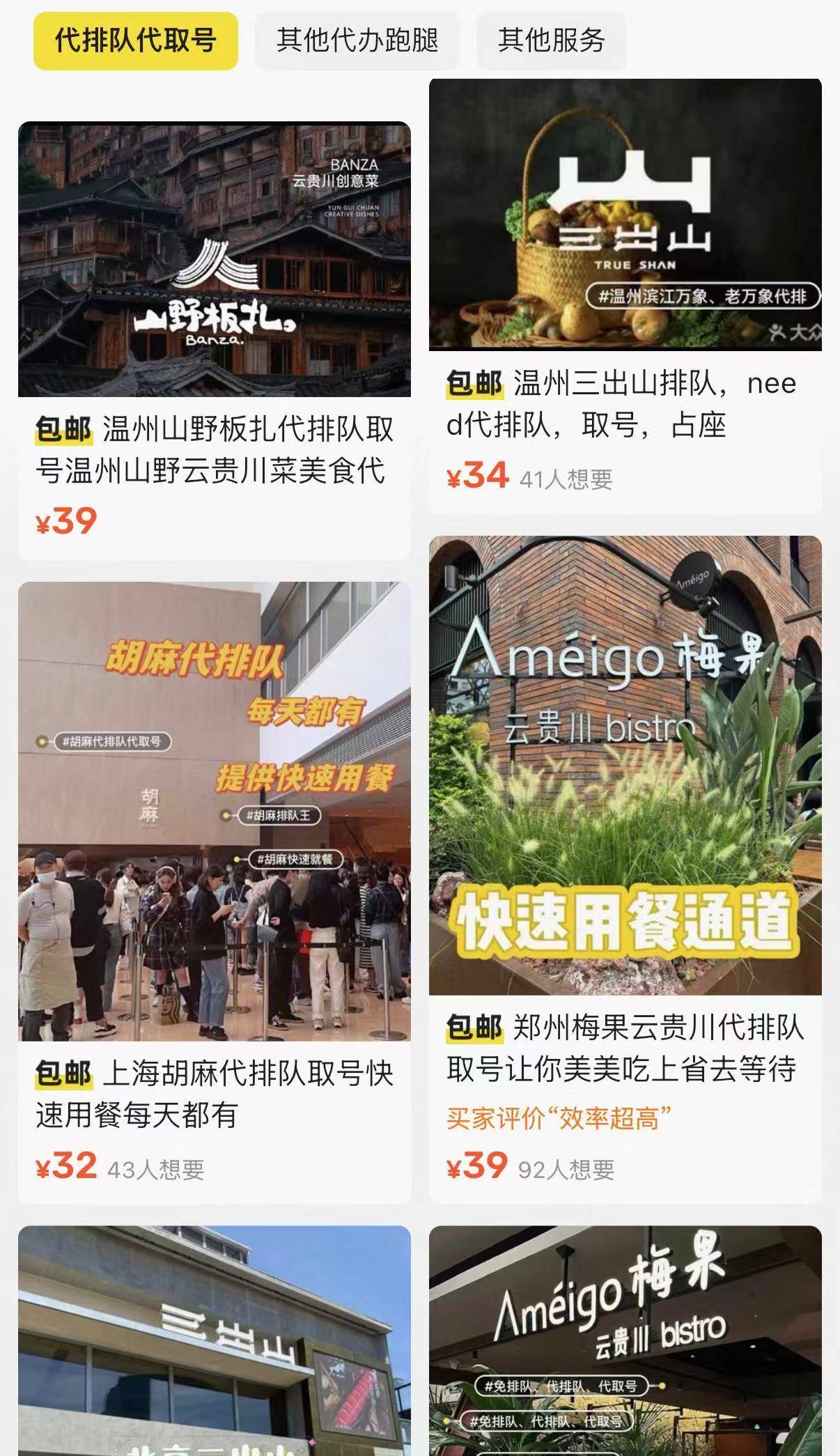 3月20日,扬子晚报/紫牛新闻记者在二手平台及社交媒体检索发现,有不少卖家公开出售网红餐厅的“代排队、代取号”服务。记者咨询了解到,以仅支持线下取号的“滨寿司”餐厅为例,有黄牛称可提供全国门店代排服务,买家付费后按约定时间到店现场交接排号,均价约40元。江苏泰州的大学生小杨告诉记者,当地一家滨寿司新店开业时,因排队人数过多,她和朋友最终在现场花50元购买“黄牛号”才顺利就餐。记者注意到,这些黄牛的代排业务覆盖多家网红餐饮品牌,包括火烧云、三出山、山缓缓等。