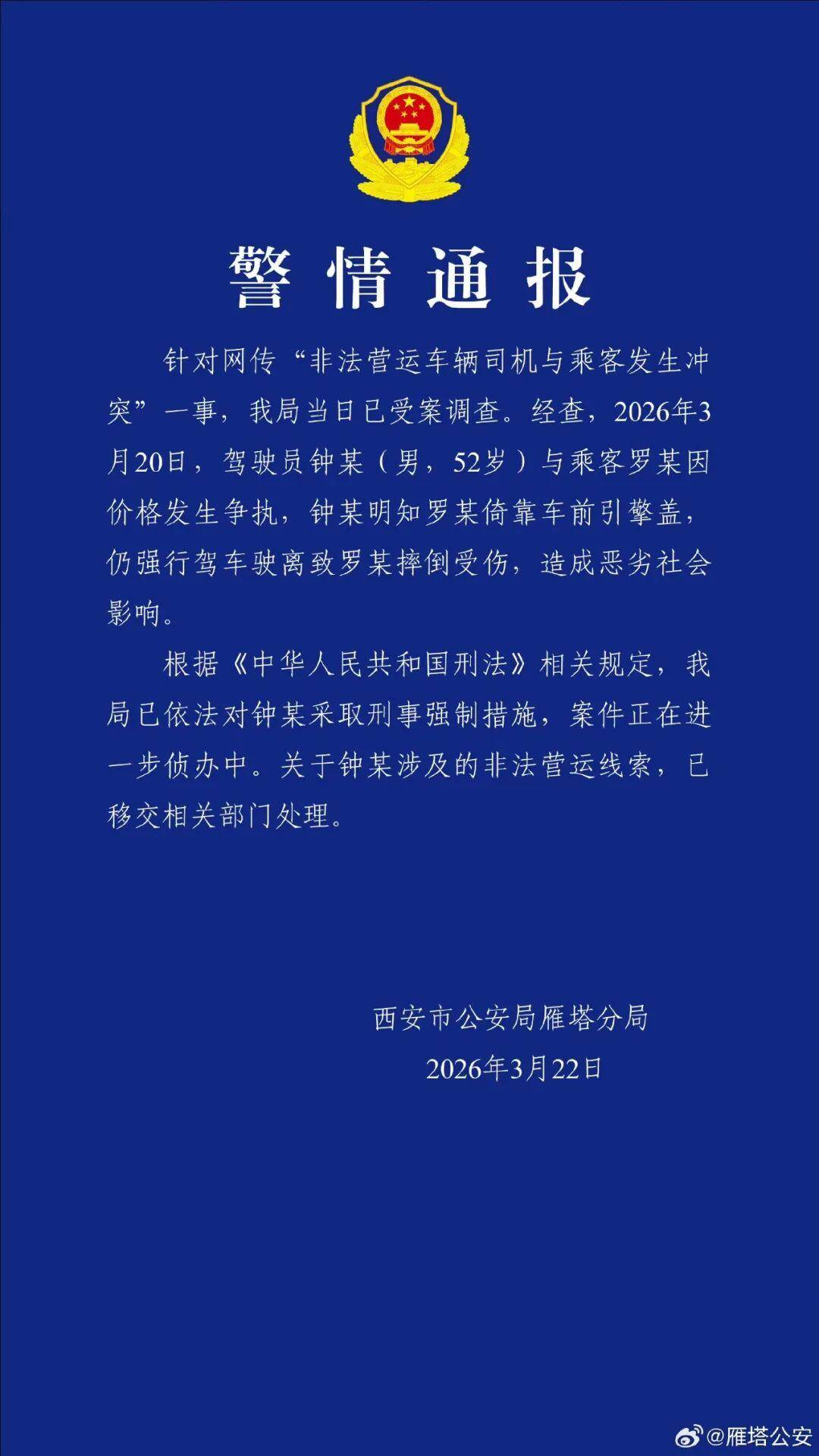陕西西安市公安局雁塔分局3月22日发布警情通报:针对网传“非法营运车辆司机与乘客发生冲突”一事,我局当日已受案调查。经查,2026年3月20日,驾驶员钟某(男,52岁)与乘客罗某因价格发生争执,钟某明知罗某倚靠车前引擎盖,仍强行驾车驶离致罗某摔倒受伤,造成恶劣社会影响。
