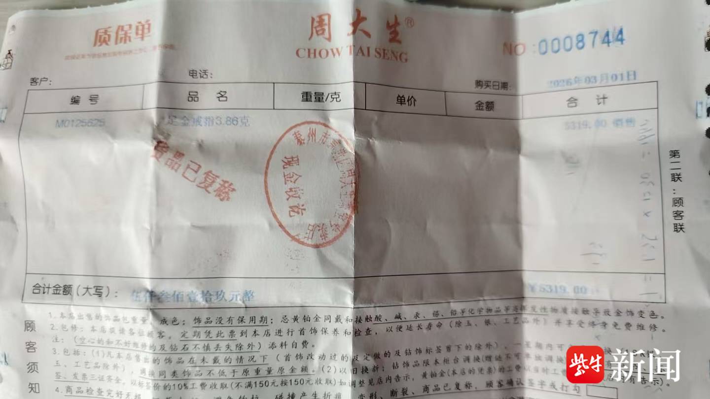 近日,江苏的吴女士(化名)在黑猫投诉平台投诉称,2026年2月21日,她和闺蜜一起去江苏泰州高港时代广场周大生门店购买了一款金戒指,花了7300元,“买回家后感觉圈口有些大了,于是第二天22日我和闺蜜一起去门店更换。当天闺蜜也决定要买这款戒指,门店店员表示店里没有合适圈口的,但可以去总部调货。”吴女士下单后,门店于2月27日到货,“我让老公去店里拿货,拿回家后,发现戒指的质保单上没有克数,金额也不对,戒指也没有吊牌。当时我对这些问题也提出了疑问,对于没有吊牌店员给予的解释是要得太急,老板娘直接把货给拿回来了,吊牌起码还要等一个礼拜。因为要到公司去录系统比较繁琐。后来门店在3月1日给我们重新开了质保单,基于对周大生品牌的信任,就复称了克重,没有纠结吊牌问题。”