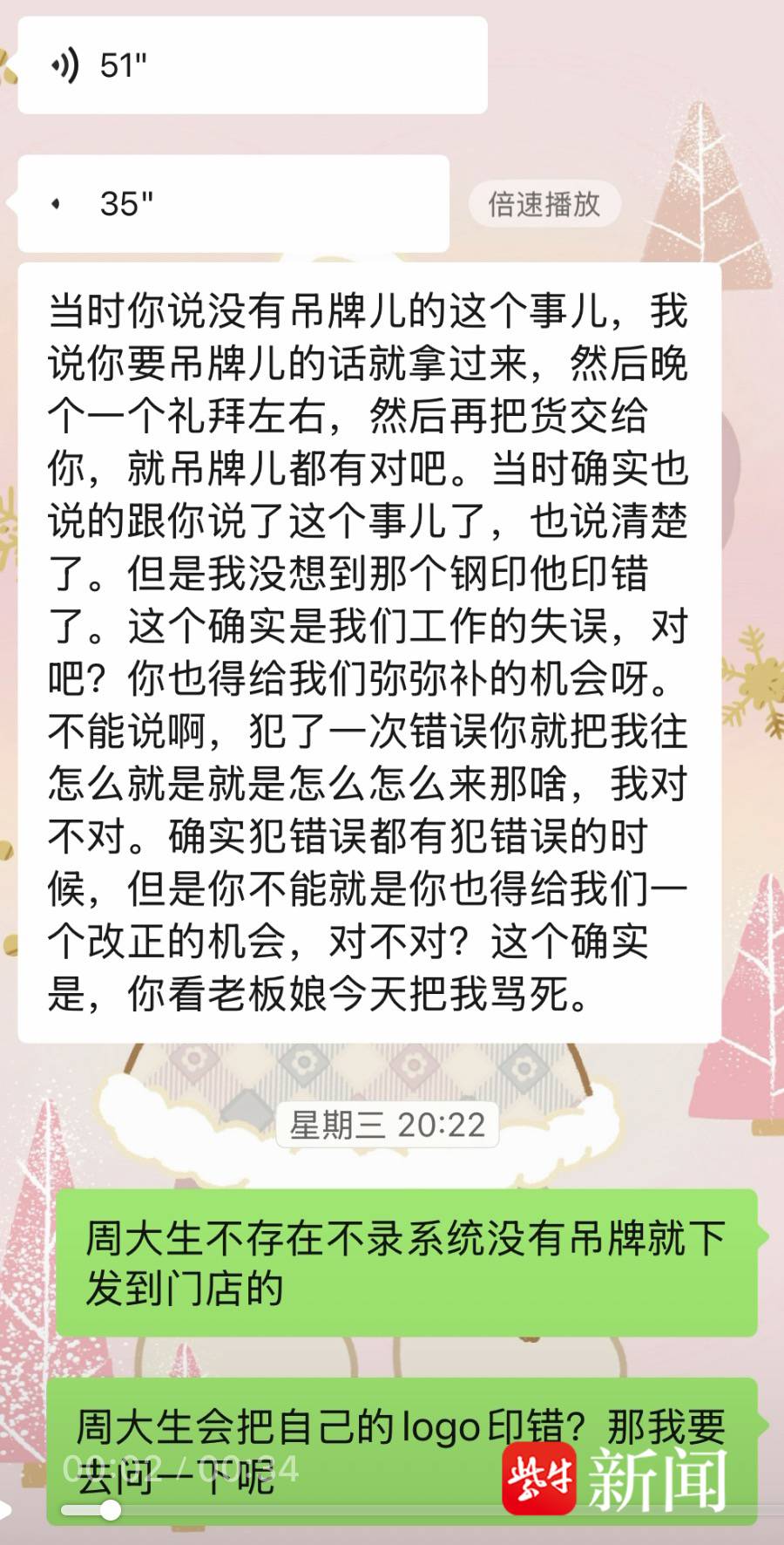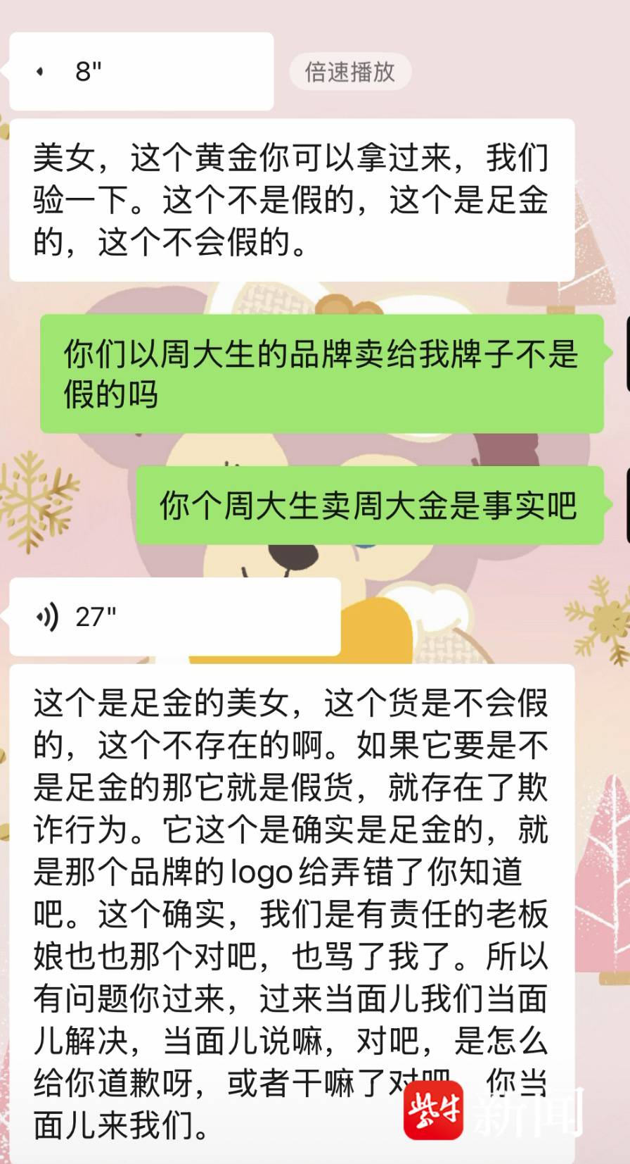 吴女士的闺蜜也晒出自己购买的戒指和票据表示拿到的戒指确实印着“周大金”。从吴女士提供的和门店店员的聊天记录和录音中得知,门店店员曾表示:“货是足金的,肯定不是假的,只是钢印印错了,是我们的失误,我们确实有责任,请求给弥补的机会。”