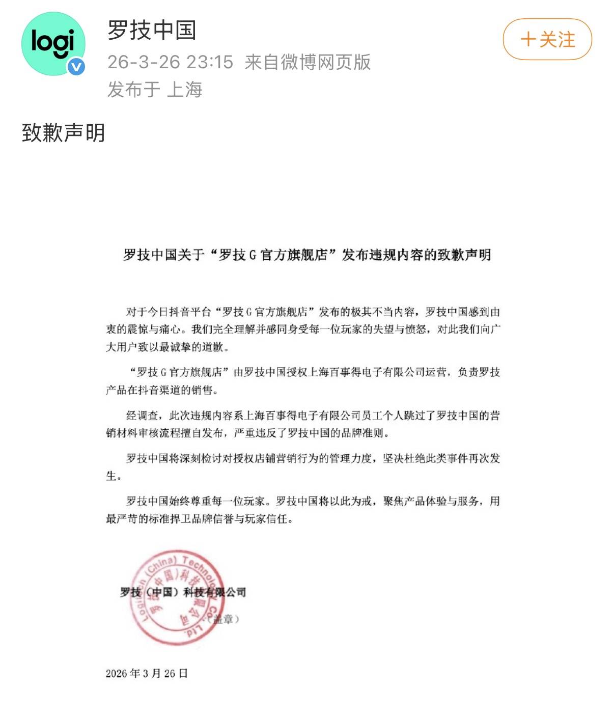 声明称,对于3月26日抖音平台“罗技G官方旗舰店”发布的极其不当内容,罗技中国感到由衷的震惊与痛心。完全理解并感同身受每一位玩家的失望与愤怒,对此向广大用户致以最诚挚的道歉。