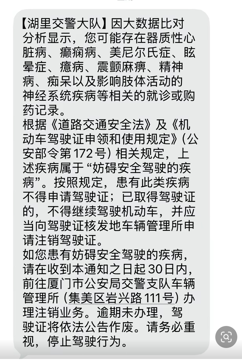 紫牛新闻记者注意到,这条备注为“湖里交警大队”的短信内容为:因大数据比对分析显示,您可能存在器质性心脏病、癫痫病、美尼尔氏症、眩晕症、癔病、震颤麻痹、精神病、痴呆以及影响肢体活动的神经系统疾病等相关的就诊或购药记录。根据《道路交通安全法》及《机动车驾驶证申领和使用规定》,上述疾病属于妨碍安全驾驶的疾病。按照规定,患有此类疾病不得申请驾驶证;已取得驾驶证的,不得继续驾驶机动车,并应当向驾驶证核发地车辆管理所申请注销驾驶证。如您患有妨碍安全驾驶的疾病,请在收到本通知之日起30日内,前往厦门市公安局交警支队车辆管理所办理注销业务。逾期未办理,驾驶证将依法公告作废。请务必重视,停止驾驶行为。