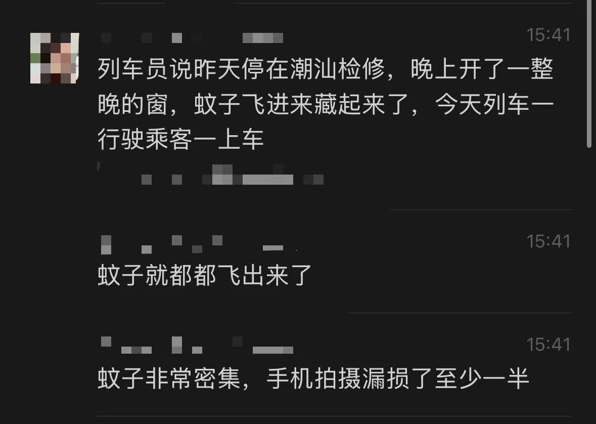 刘嘻嘻透露,对于蚊虫涌入车厢的原因,列车员曾解释称,列车前一日停在潮汕地区检修,当晚开了一整晚的车窗,导致蚊子飞进车厢藏了起来,等到31日列车启动、乘客上车后,蚊子才飞出。
